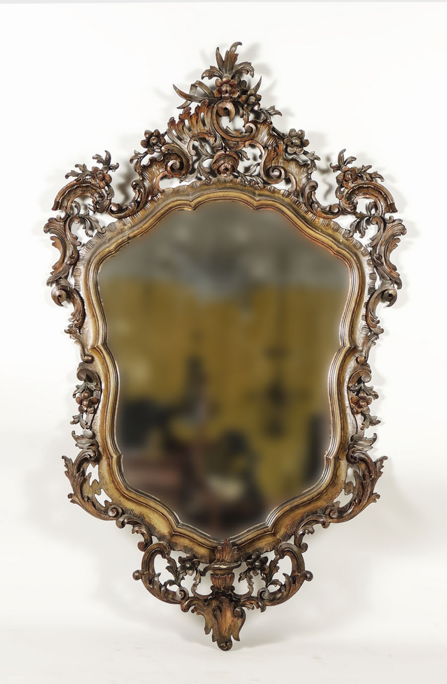 SPECCHIERA IN LEGNO LACCATO inizio del XX secolo forma sagomata, cimasa intaglita con motivi rocaille e tralci di fiori ricadenti ai lati cm 137x84 LACQUERED MIRROR, EARLY 20TH CENTURY