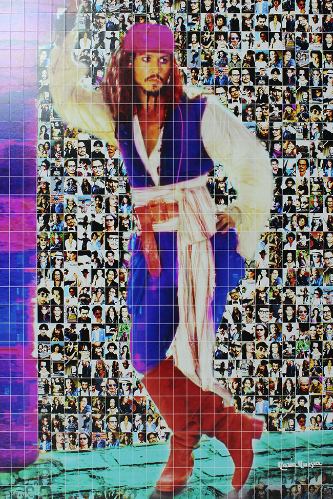 MARIA MURGIA, "Omaggio a Johnny Depp", 2022, fotomosaico digitale montato su pannello Kapafix cm 1 e intagliato a mano, cm 75x50, peso 1 kg. Opera con autentica su foto dell'artista. Al fronte: firma in basso a destra. Al verso: etichetta Certificato di autenticità con firma dell'artista.