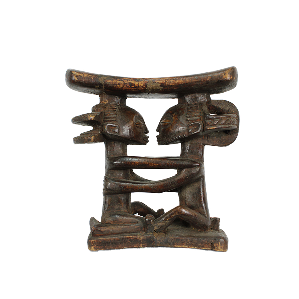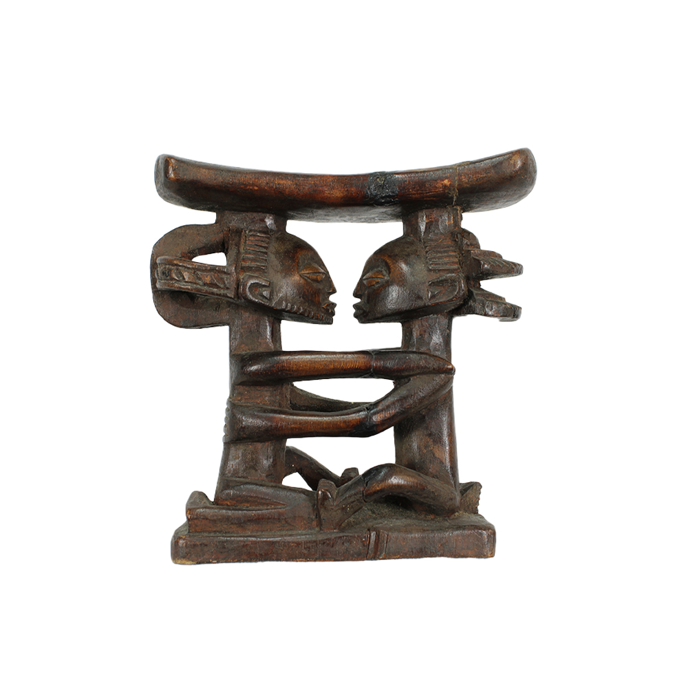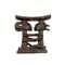 POGGIATESTA A CARIATI etnia Luba in legno e patina bruna. Poggiatesta raffigurante antenati con elaborate acconciature tipiche dei ranghi elevati. Utilizzato per mantenere l'acconciatura durante il riposo. Repubblica democratica del Congo h cm 19,5 x 19 x 7