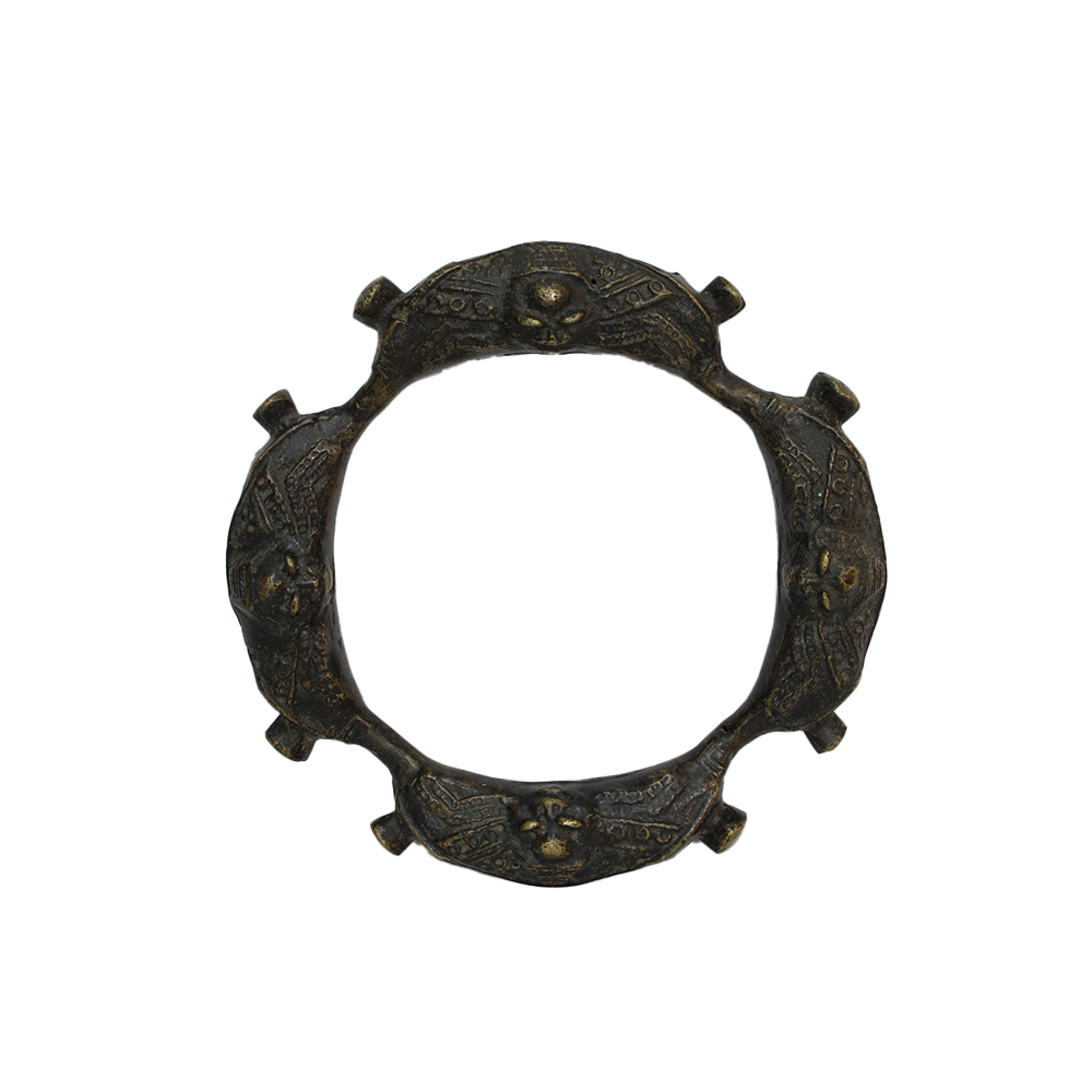 SISTRO LJEBU in bronzo dell'etnia Yoruba. Appartenente alla società segreta degli Ogboni, uomini dal grande potere politico capaci d'influenzare e deporre anche il re. Lo strumento è utilizzato in riti per ritmare le cerimonie. Nigeria cm Ø 34