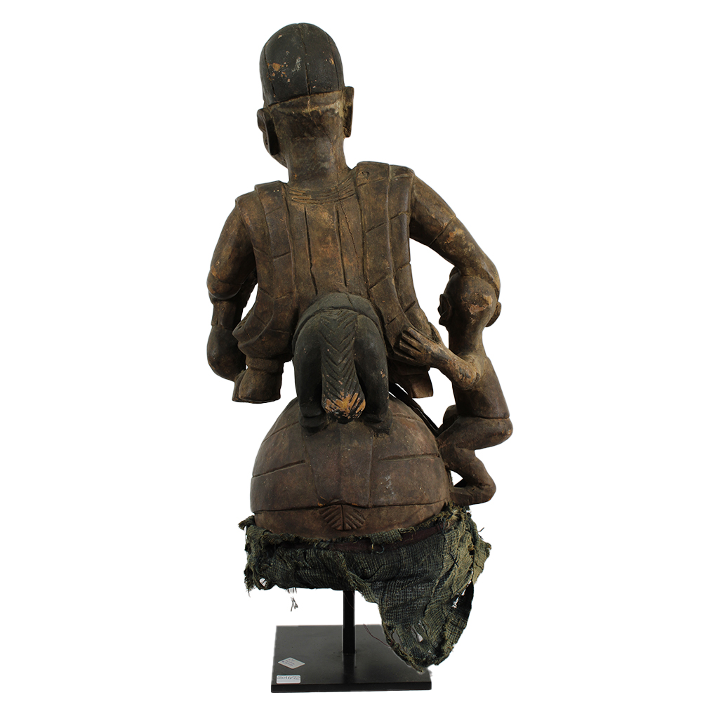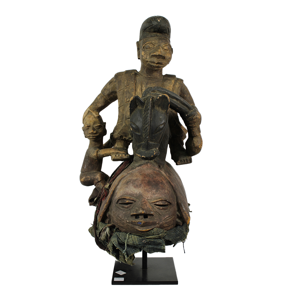 MASCHERA IGI GELEDE dell'etnia Yoruba in legno pigmenti e residui di vestito da cerimonia. Il guerriero protegge con una mano un bimbo in ricordo del mitico combattente Jaguninagun. Nigeria h cm 62 x 30 x 23