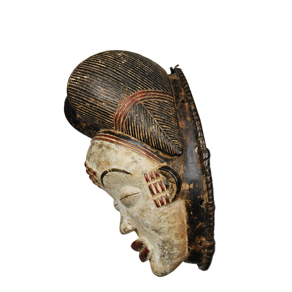 MASCHERA FRONTALE OKUYI DEI PUNU O LUMBO in legno policromo , raffigurante viso di donna protettrice contro la magia nera. Gabon h cm 30 x 20 x 16