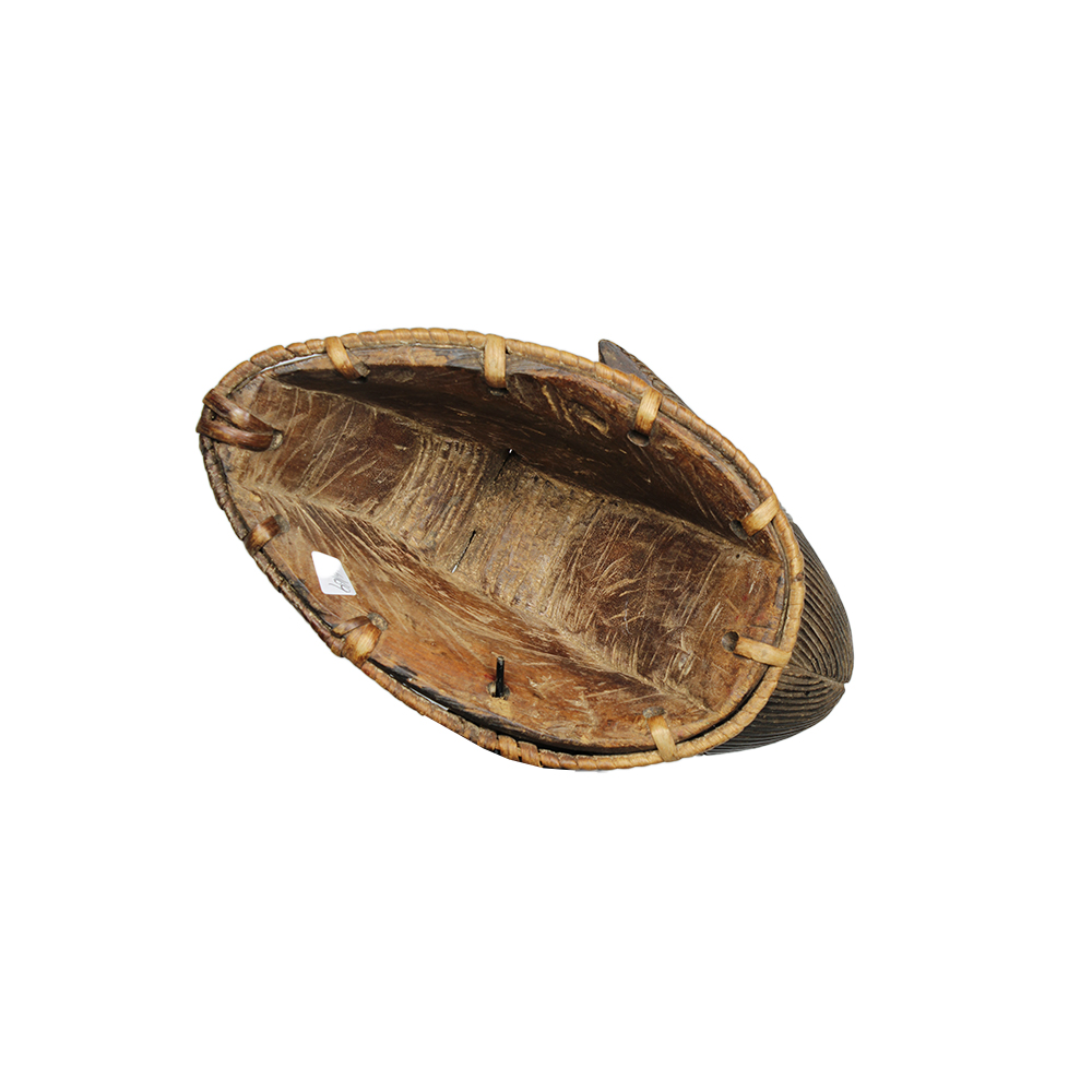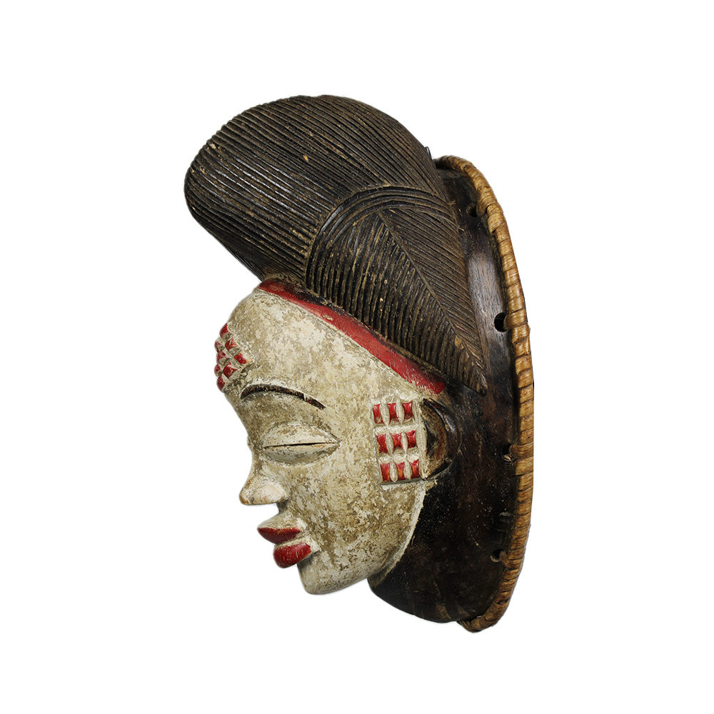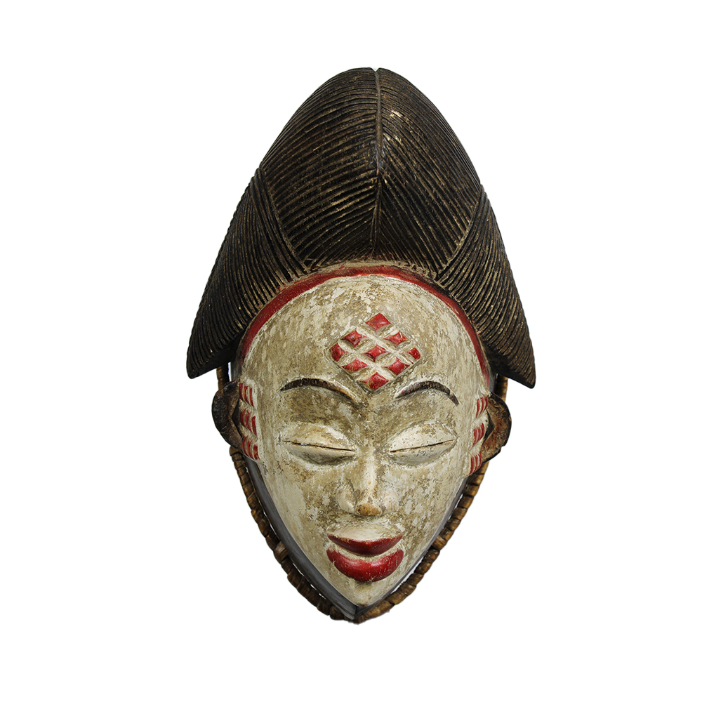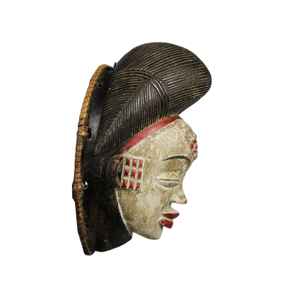 MASCHERA FRONTALE OKUYI in legno policromo utilizzata per cerimonie funerarie ed iniziatiche, indossate da giovani su trampoli alle prime luci dell'alba . Gabon h cm 30 x 19 x 16