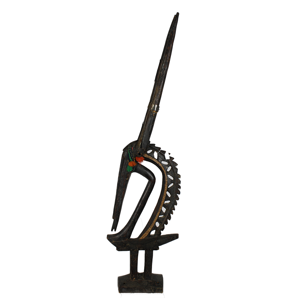 ACCONCIATURE CIMIERO CHIWARA etnia Bamana, in legno patina scura alluminio carta stampata e passamanerie,utilizzata per i riti agricoli durante la danza delle antilopi. Mali h cm 109 x 13 x 19