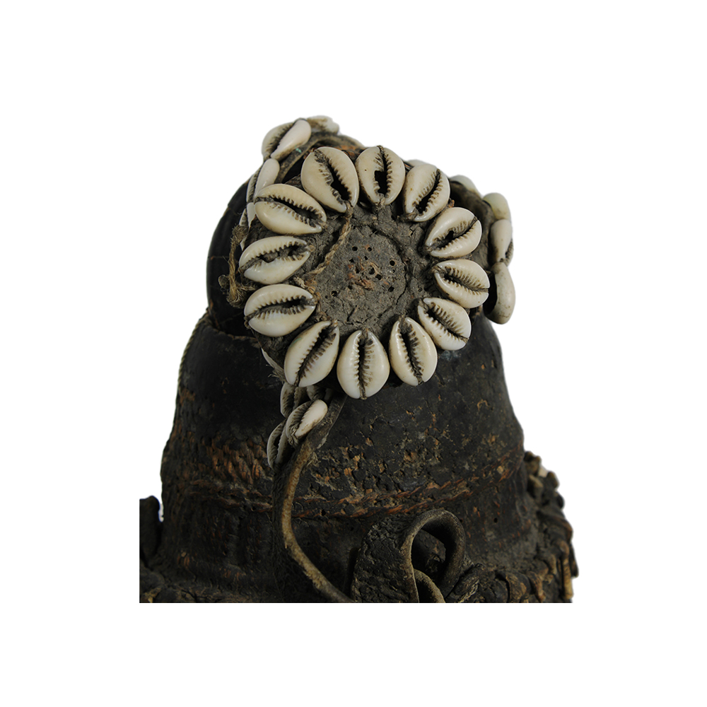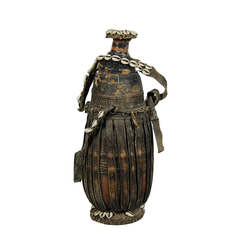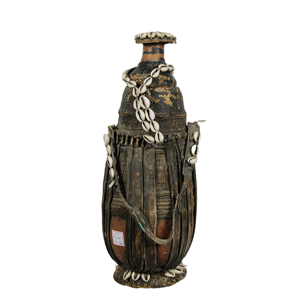 CONTENITORE PER IL LATTE in legno cuoio fibre vegetali cauri zucca e pelli di animali. Etnia Oromo Etiopia h cm 42 x 15