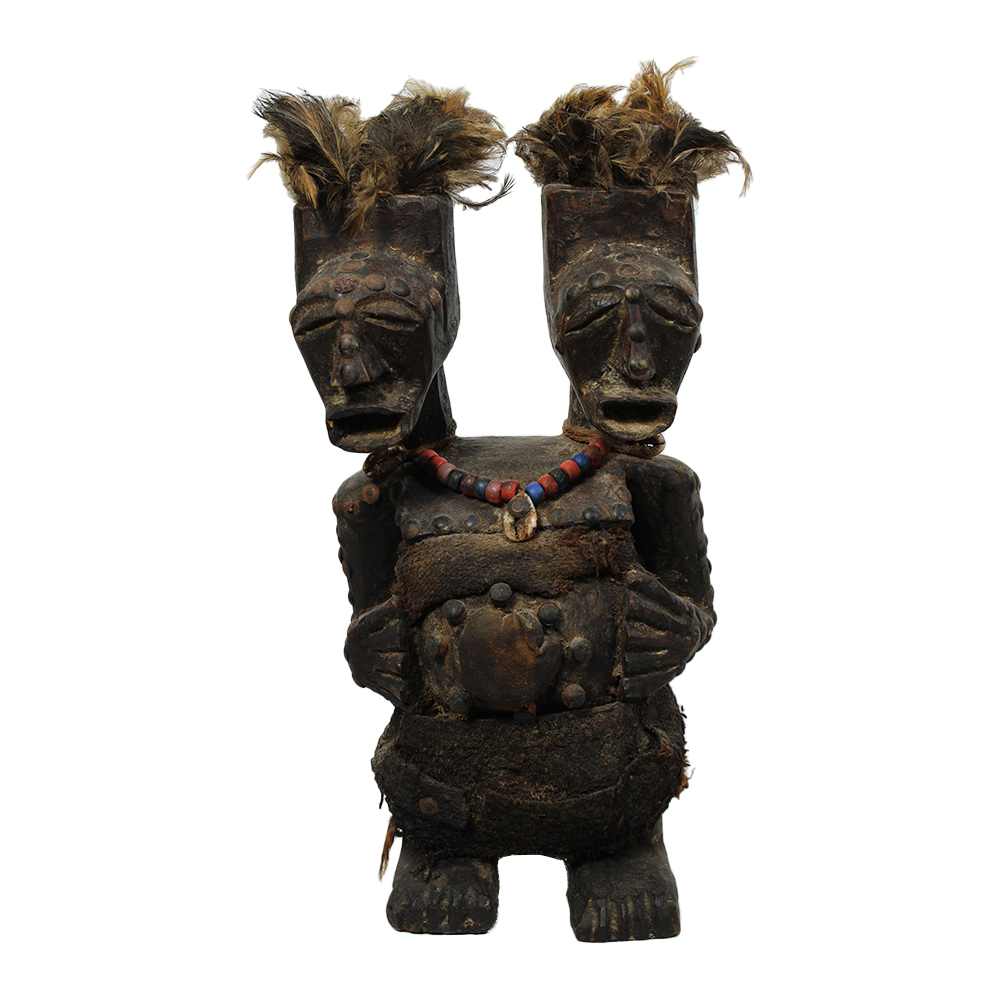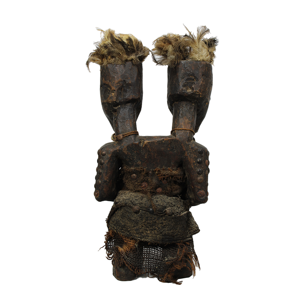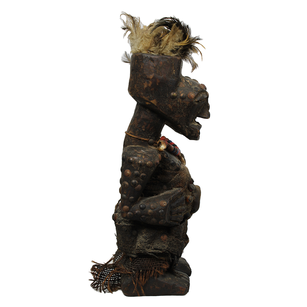 FETICCIO BICEFALO BOANGA etnia Songye in legno patina scura chiodi da tappezziere cauri perline di vetro piume di uccello materiali feticistici. Strumenti per utilizzo personale per individuare le forze del bene e del ma.e. Repubblica democratica del Congo h cm 34 x 17 x 10