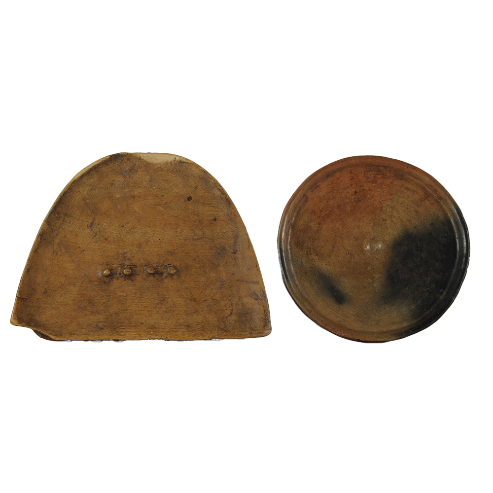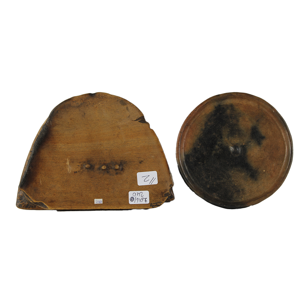 LOTTO DI 2 PIATTELLI LABIALI in legno e terracotta etnia Surma valle del Kibish. Crepa su un piattello cm Ø 12 - h cm 12 x 16,5