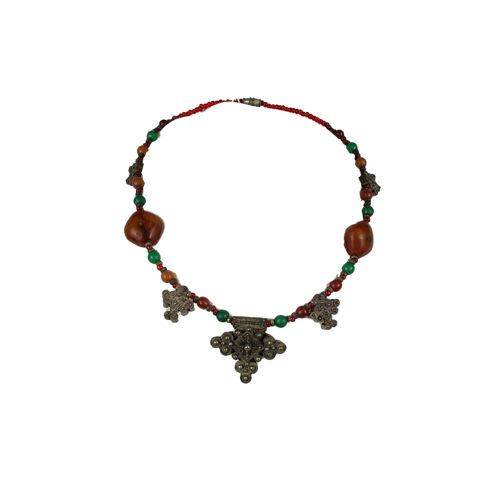 COLLANA CON CROCI BOGHDAD in metallo argentato perle di vetro ed ambra etnia mauri. Mauritania cm 20