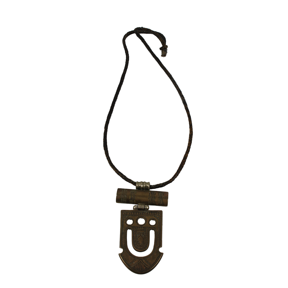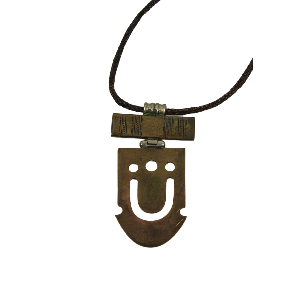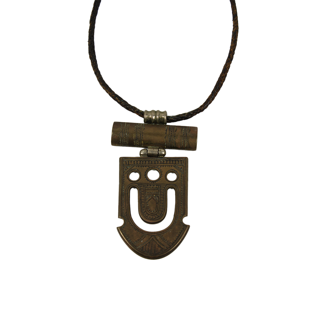 COLLANA CON TALISMANO DEI TUAREGH DEL DELTA in ottone inciso a bulino e pelle. La collana mostra i tipici disegni sahariani e una cerniera creata manualmente che mostra l'abilità dei fabbri tuaregh. Mali h cm 7,5 x 4