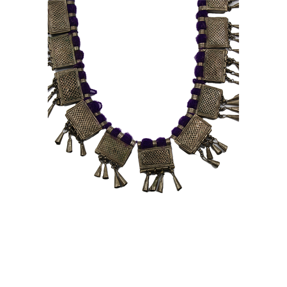 COLLANA MERGAF etnia Wollo in filo di lana ed argento, le piccole scatole servono per contenere sostanze talismaniche. Eritrea cm Ø 18