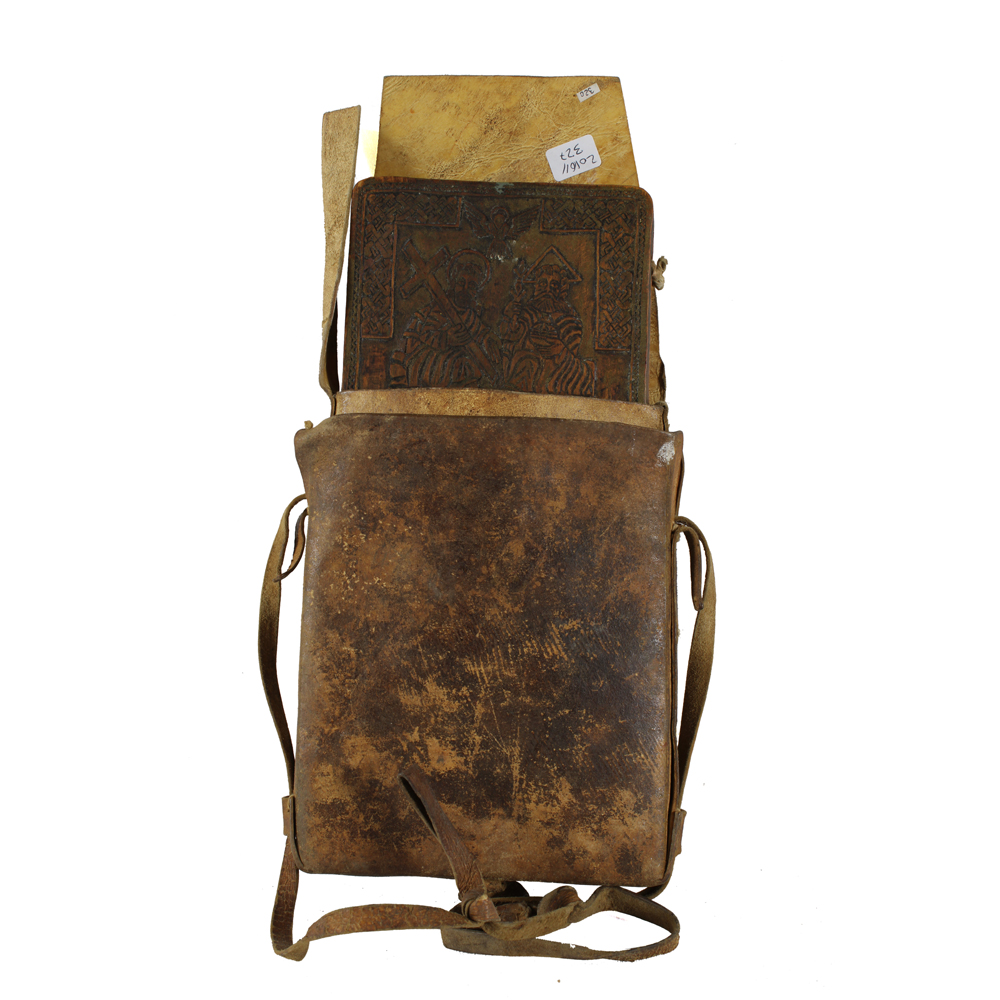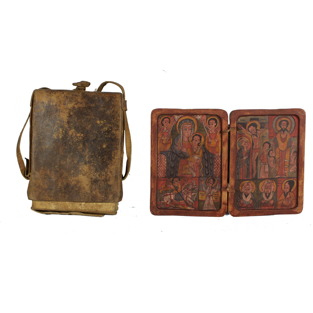 ICONA DA VIAGGIO CON CUSTODIA AMHARA in legno scolpito e cuoio, dipinta su tavolette di legno di cedro e ulivo accompagnava il pellegrino nei viaggi in luoghi sacri come Lalibela. Etiopia h cm 21 x 15,5