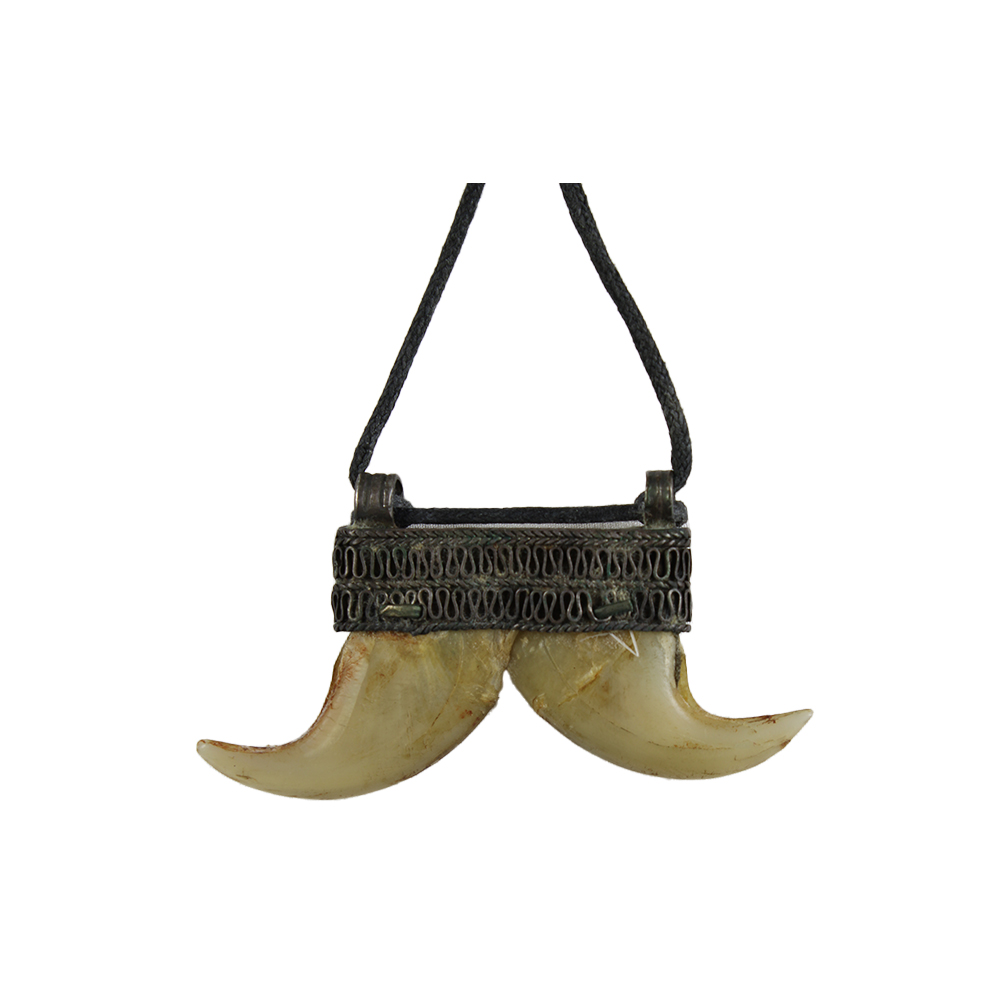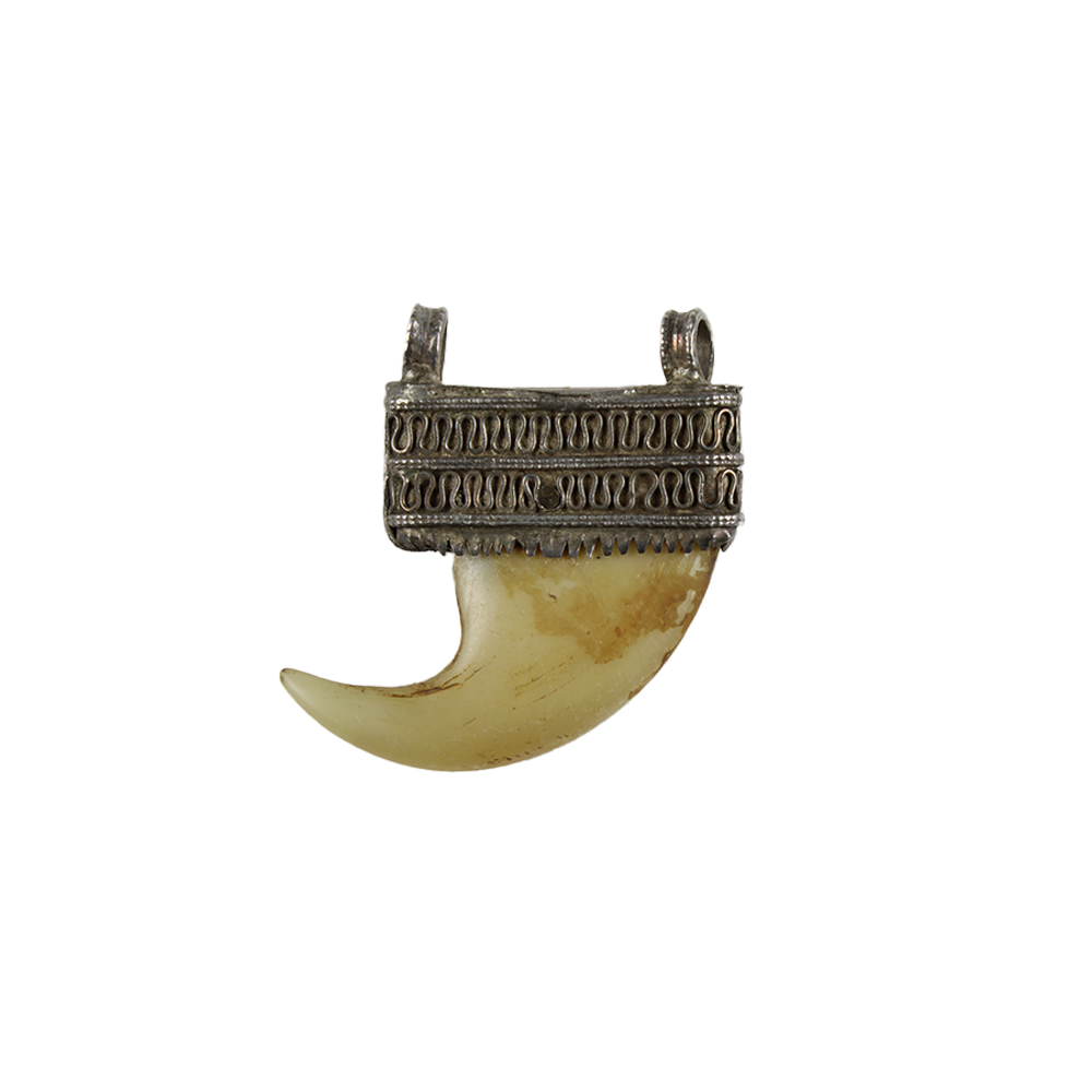 PENDENTI TEFER etnia Amhara e Oromo in metallo argentato e unghia di leone. Oggetti portati al collo dagli uomini, di un certa rarità dato che in quelle zone i leoni sono scomparsi da tempo. Etiopia h cm 4,5 x 4,5 h cm 3,8 x 7