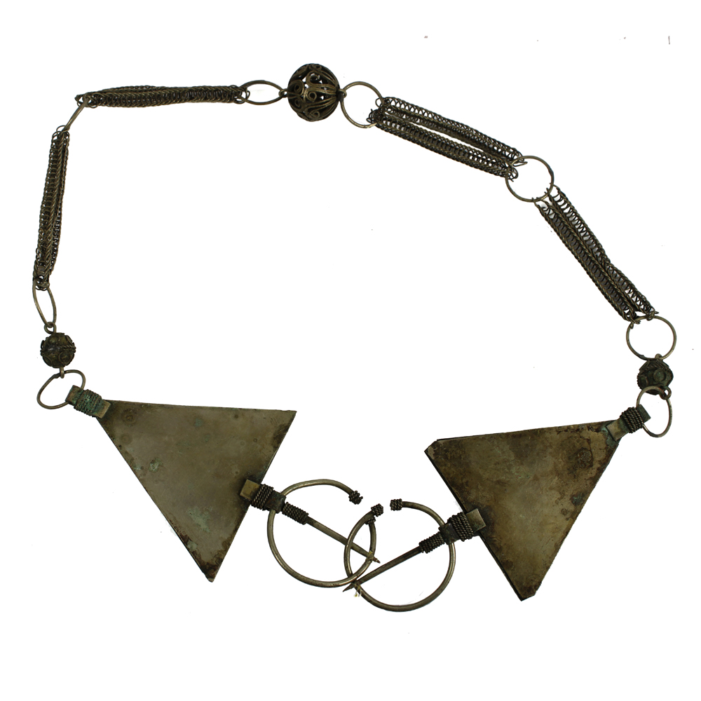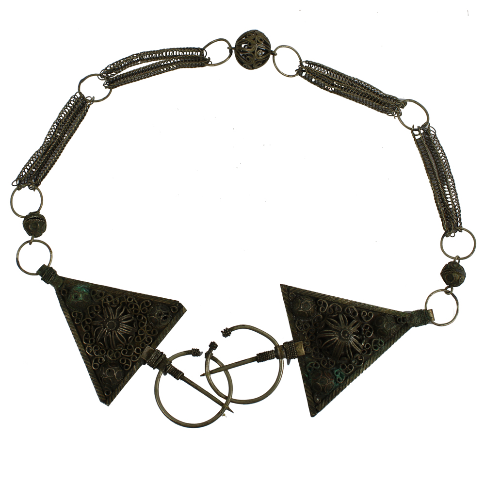 FIBULA DOPPIA FERMA MANTELLO TIZERZAI DEI BERBERI DELL'ALTA VALLE DEL DRA in metallo argentato filigranato, ricco gioiello cerimoniale indossato solo per festival e cerimonie particolarmente importanti. Marocco h cm 80 x 8