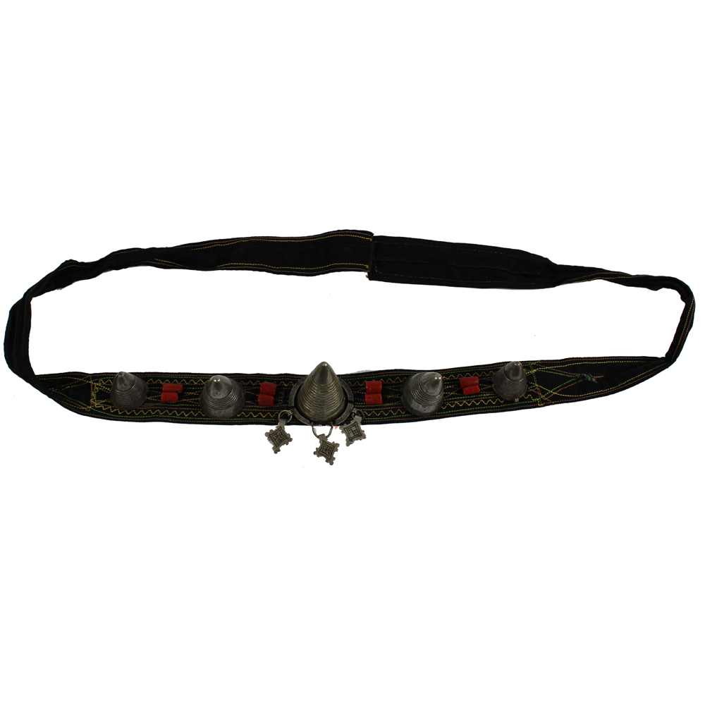ORNAMENTO PER ACCONCIATURA FEMMINILE etnia berbera Ait Herbil in metallo bianco parzialmente niellato stoffa cotone ricamato e corallo rosso mediterraneo. E' un tipo di ornamento molto in uso tra le donne berbere caratterizzate per lo spirito indipendente. Anti Atlante occidentale h cm 115 x 3,5