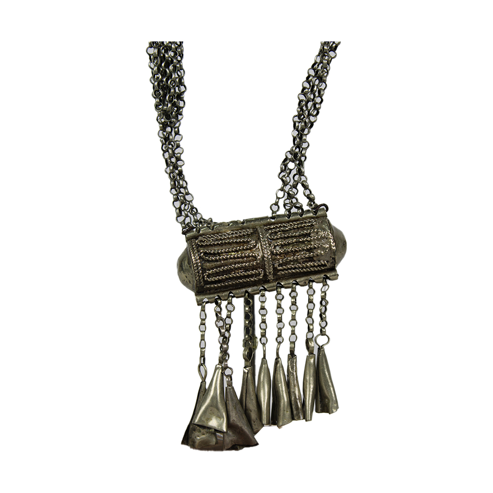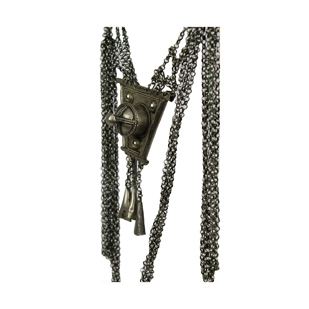COLLANA A DOPPIO PENDENTE OROMO in metallo argentato Le donne della provincia di Jima indossano queste collane con un pendente sul petto e uno sulla schiena. Le donne islamiche investono molto sui gioielli in quanto in caso di ripudio del marito possono tenere per se solo quelli. Etiopia h cm 28 x 10