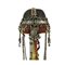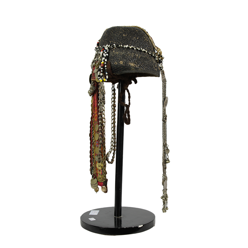 PARURE DA TESTA formata da un ornamento facciale burqa e da orecchi, in tessuti ricamati, metallo, coralli, perline di vetro, ambra, pietra levigata, vecchie monete e prove di conio. Parure matrimoniale caratterizzata da pendenti che coprono il naso e la bocca come da dettami dell'islam. Medio Oriente h cm 50 x 18,5