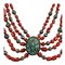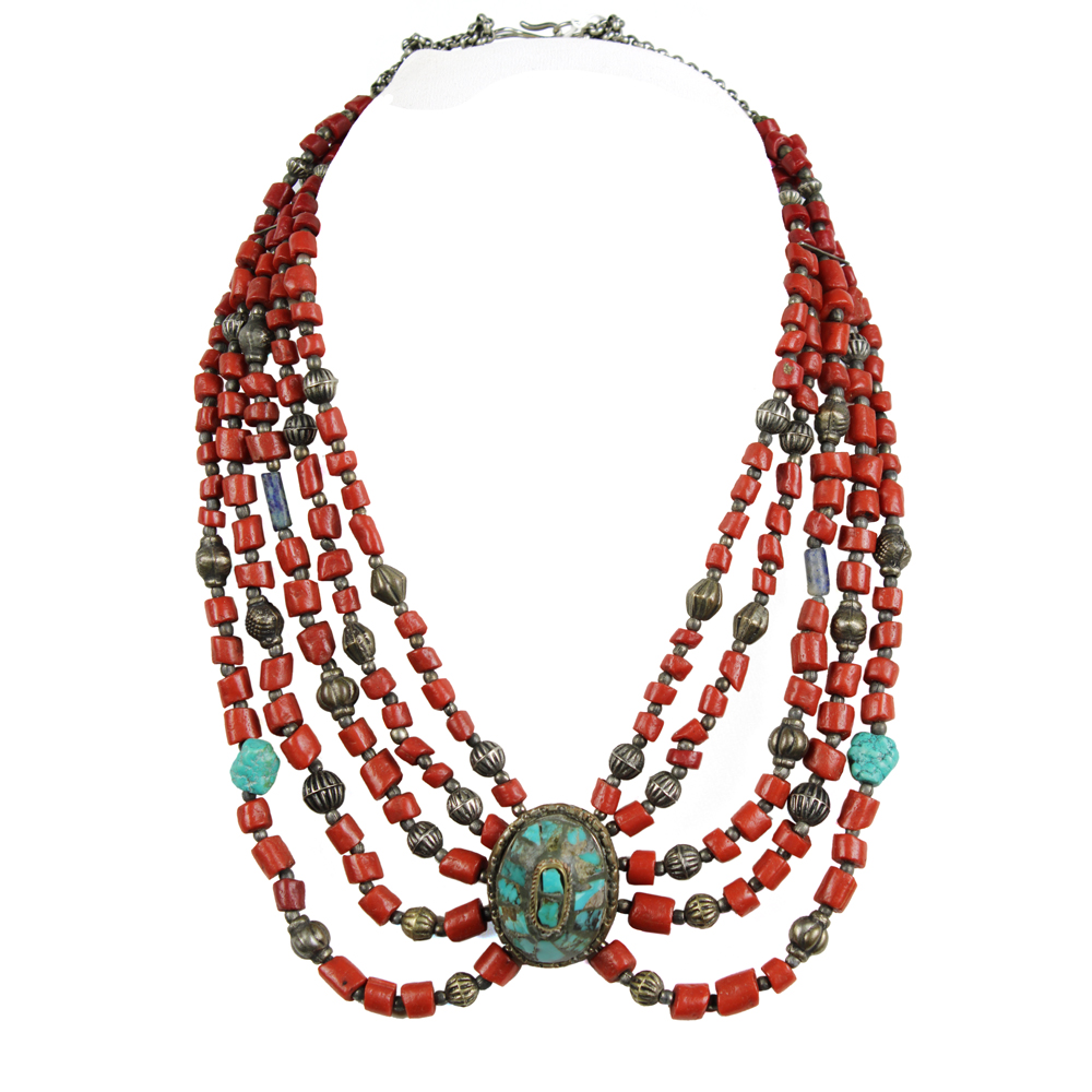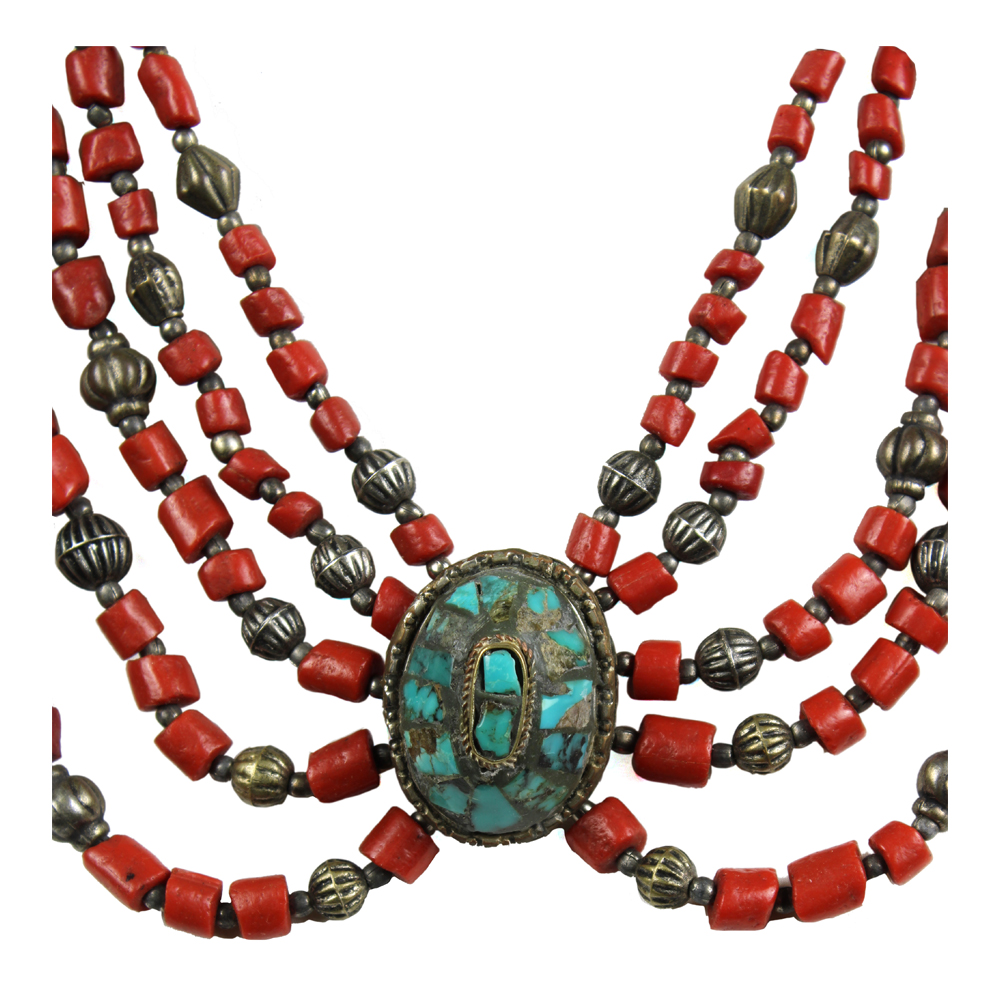 COLLANA CON RELIQUIARIO GAU LODAKH in metallo argentato turchesi corallo e lapislazzuli. India cm 28