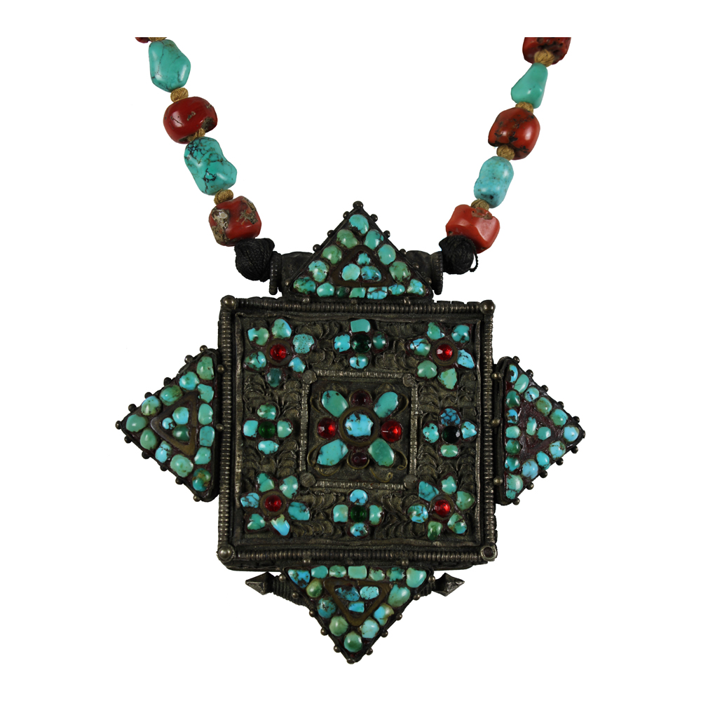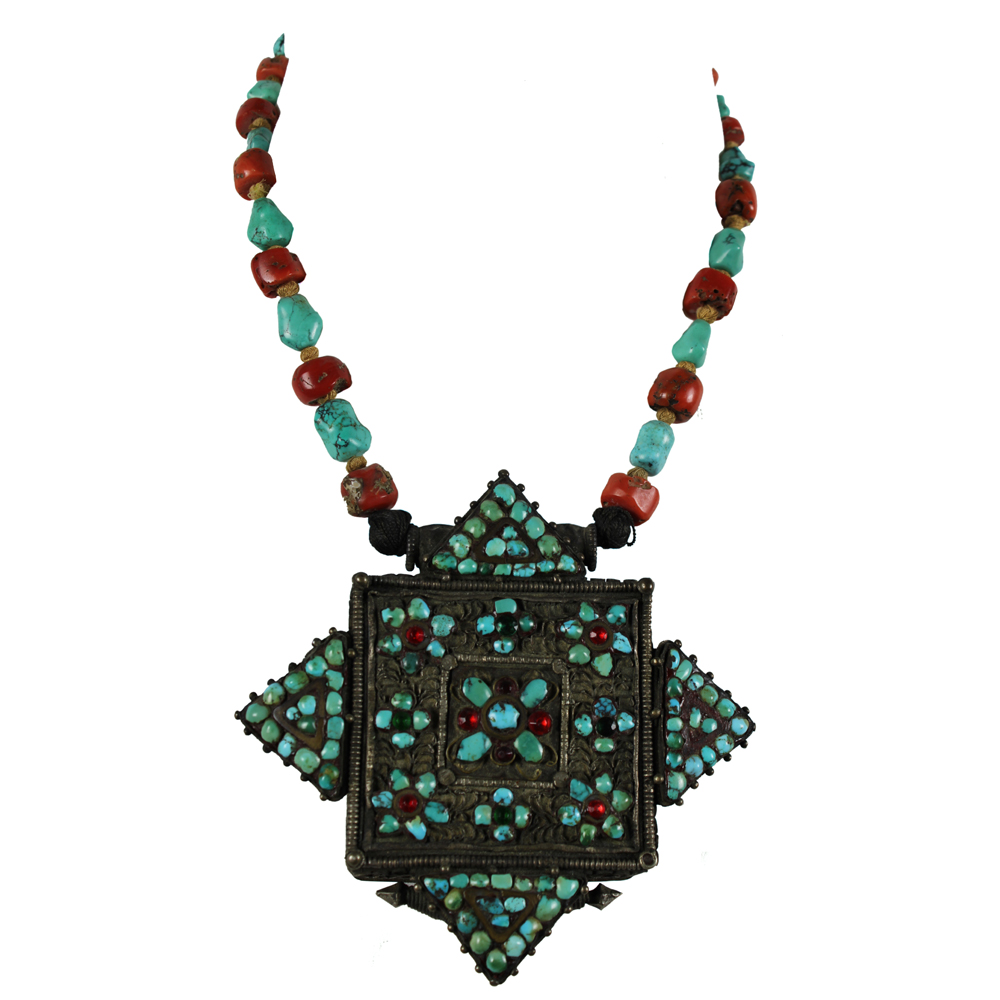 COLLANA CON RELIQUIARIO GAU LADAKH in metallo dorato, turchesi, coralli e perline di vetro colorato. I reliquiari contenenti sostanze sacre o mantra venivano portate dalle donne aristocratiche Ladakh e del Tibet. India h cm 33 x 12