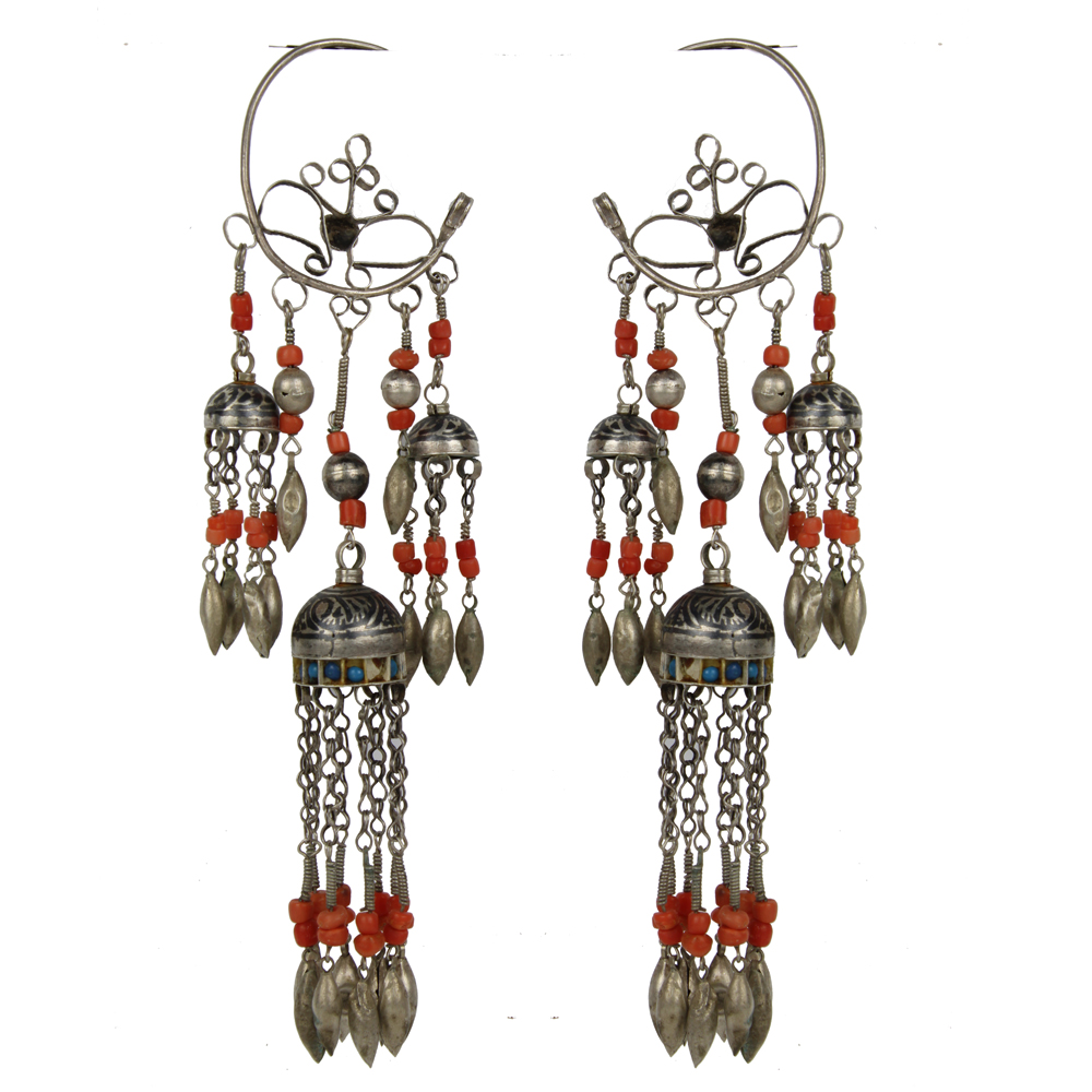 ORECCHINI KHALKA in argento niellato turchesi e corallo. Uzbekistan h cm 17 x 4