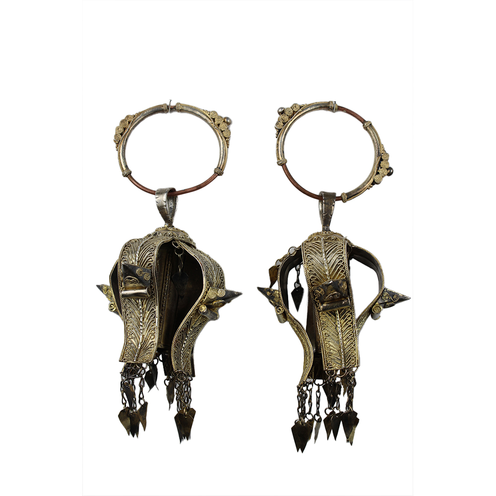 COPPIA DI ORECCHINI in argento dorato finemente lavorati dalle mani di abili artigiani indiani. Gli orecchini sono impreziositi da graziosi piccoli pendenti. India h cm 14 x 7