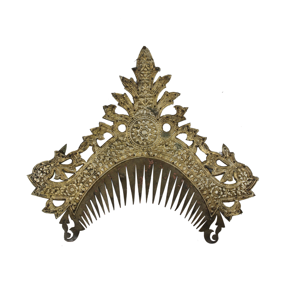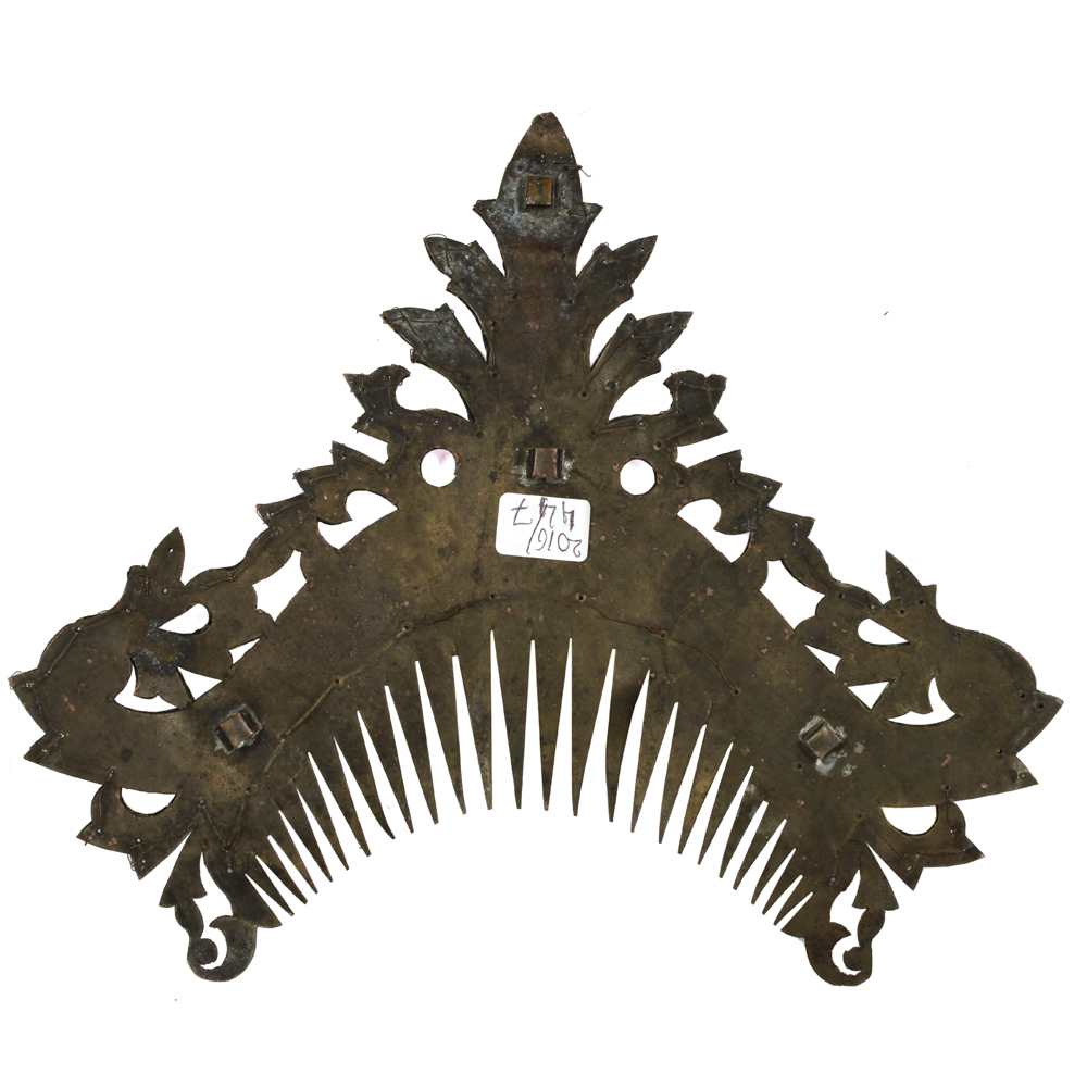 PETTINE PER ACCONCIATURA FRONTALE LAMPUNG in ottone sbalzato e rame. Sumatra h cm 21 x 23
