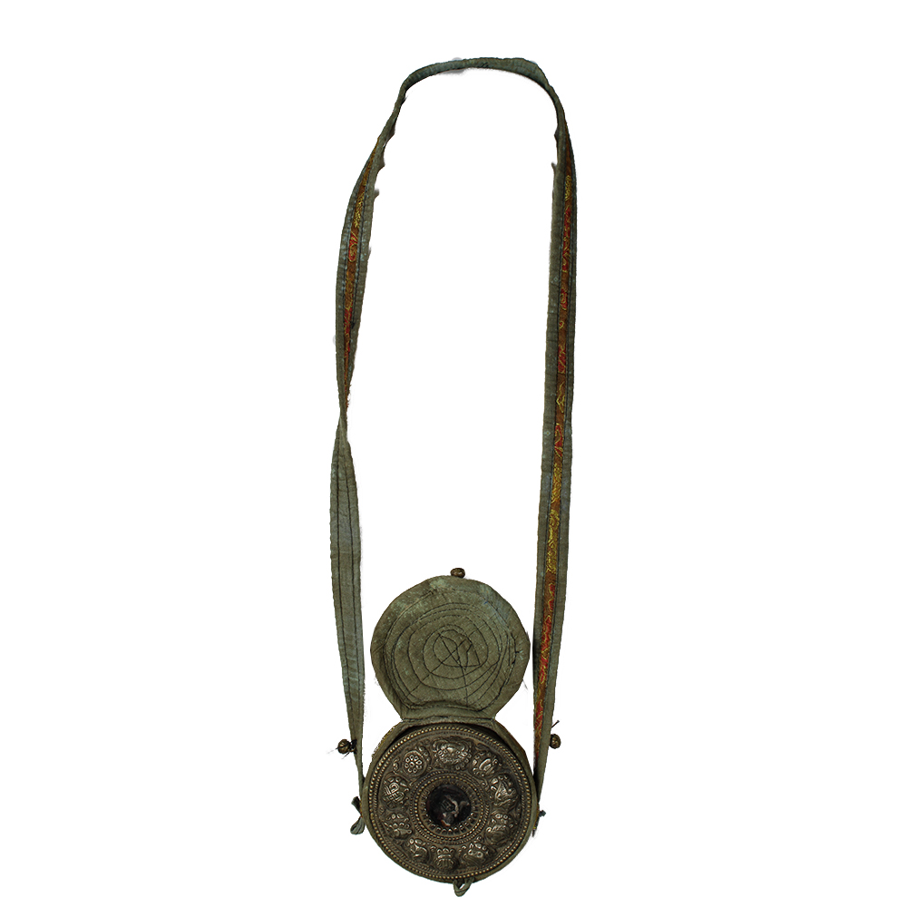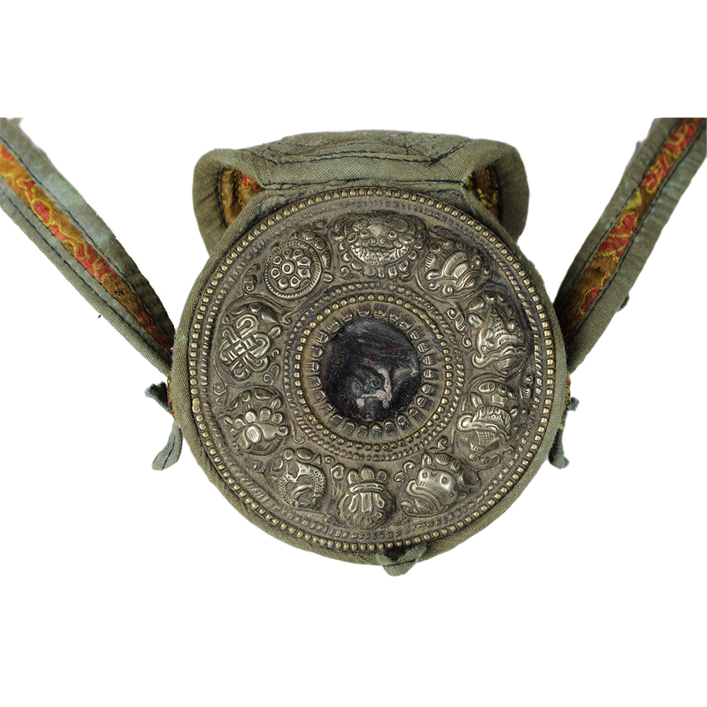 RELIQUIARIO GAU in metallo argentato terracotta smaltata vetro e stoffa. Tibet h cm 54 x 10