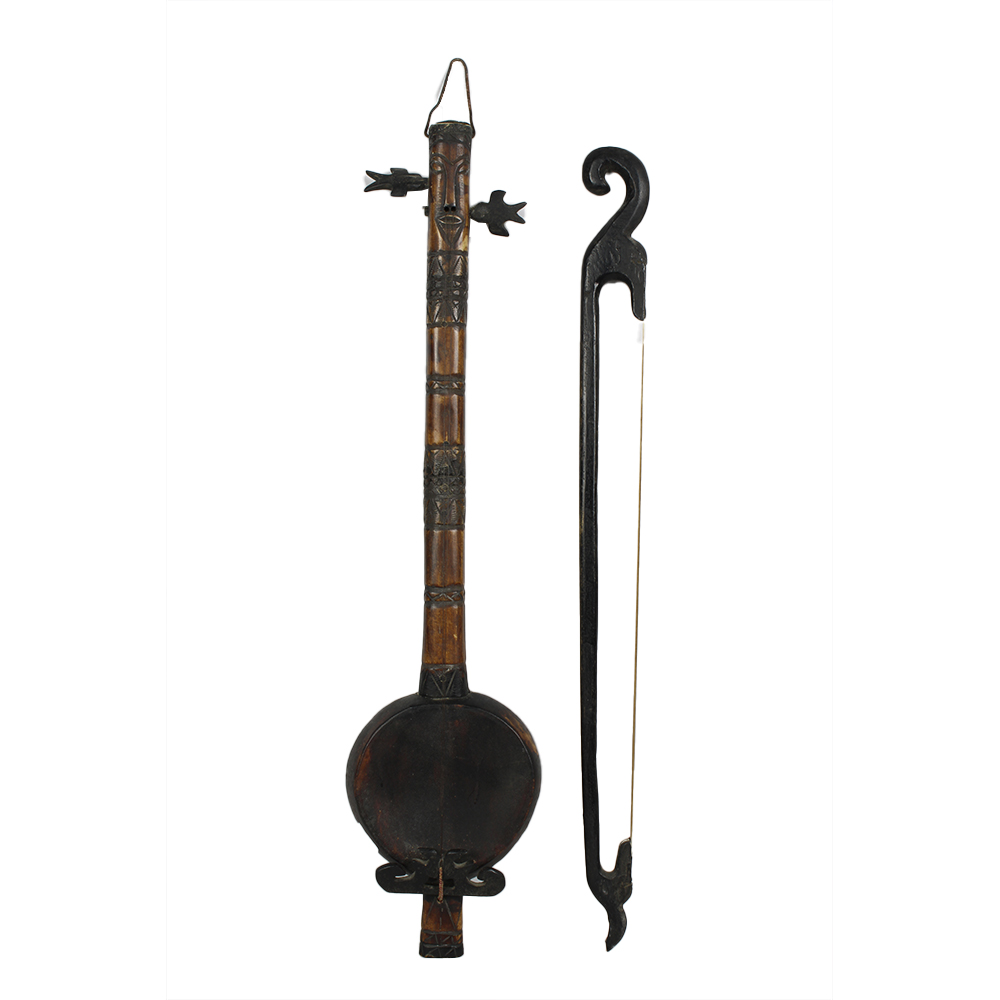 STRUMENTO MUSICALE A CORDE in legno, noce di cocco e corde. Bali Indonesia h cm 52 x 13 , archetto cm 52