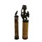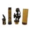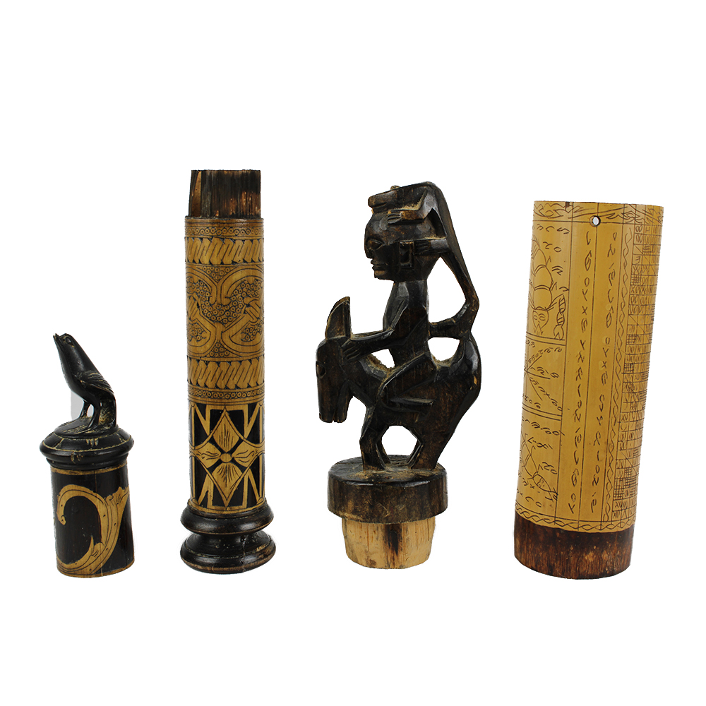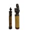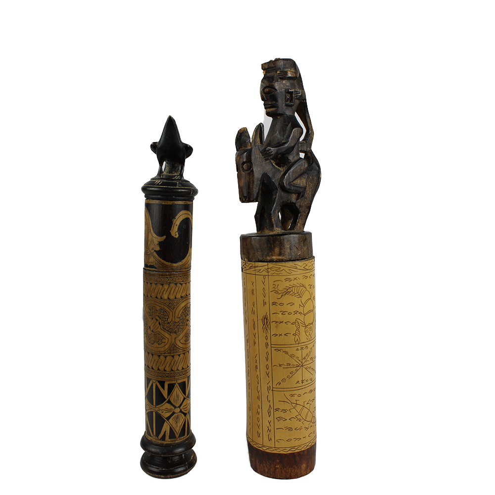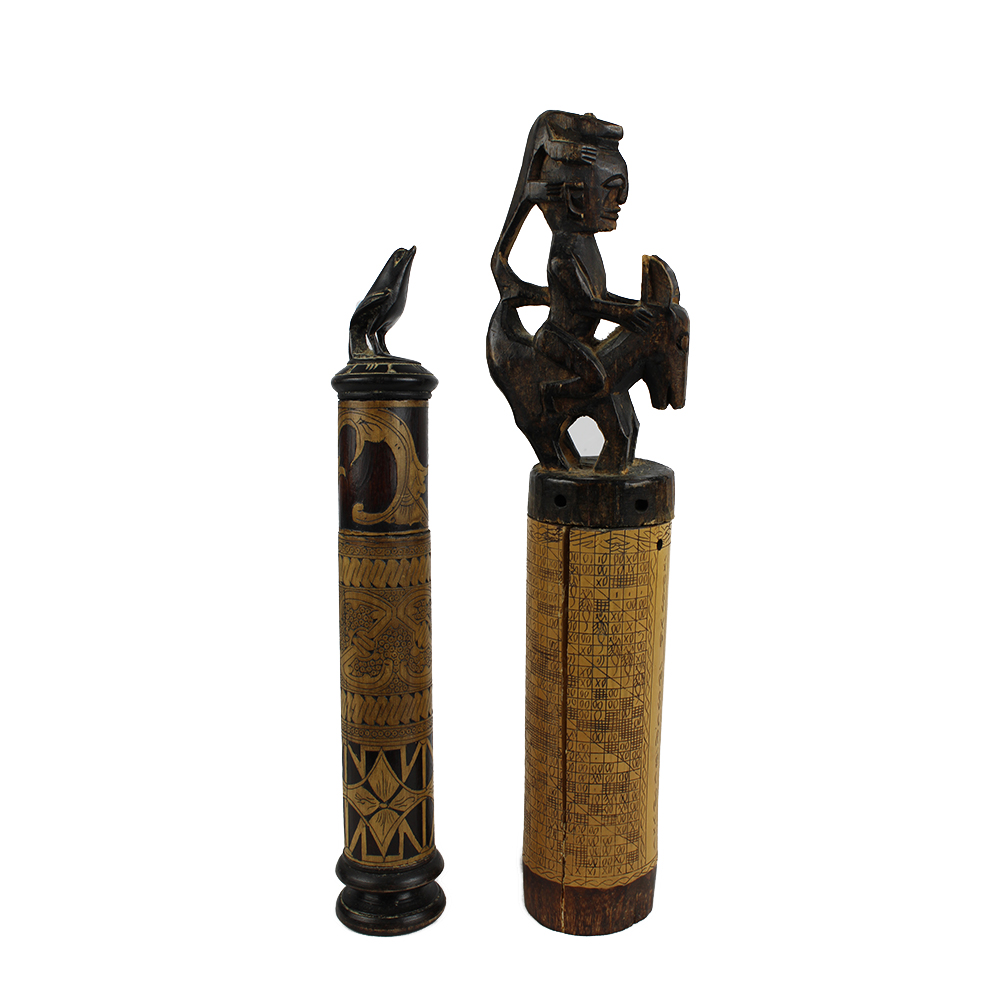 LOTTO DI 2 CONTENITORI PER MEDICINE in bambù' e legno decorati con cere nere. I tappi dei contenitori riproducono figure animali. Lombok e Sumatra. Indonesia h cm 32 x 5,5 - h cm 27 x 4,5