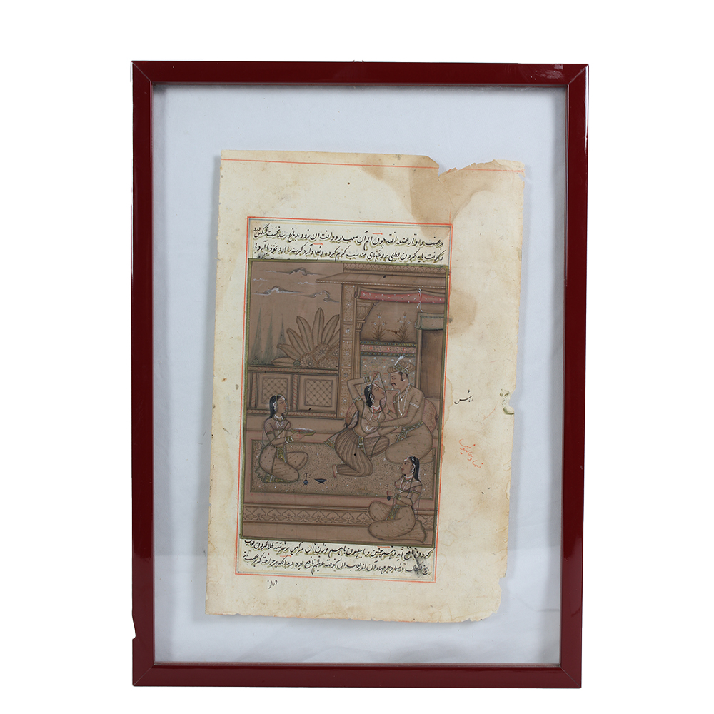 MINIATURA raffigurante membro della dinastia Moghul in galante compagnia di tre fanciulle. L'immagine è supportata da iscrizioni arabe. Presenza di usure sul foglio che supporta la miniatura. India h cm 31,5 x 20,5 - cornice h cm 42 x 30,5
