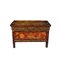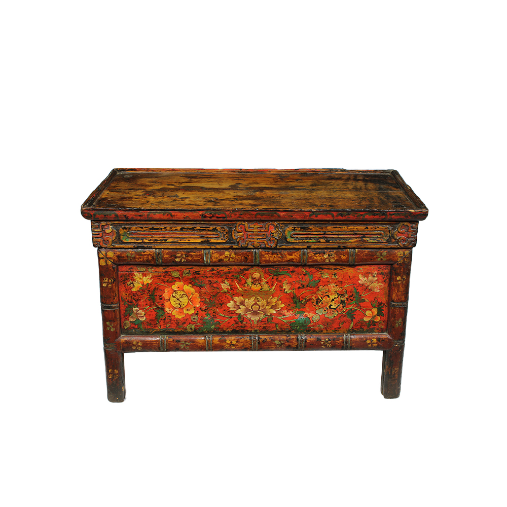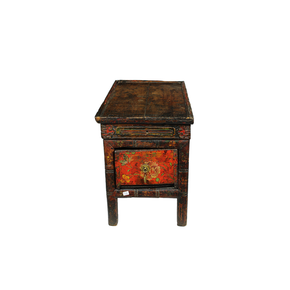 TAVOLINETTO DA PREGHIERA in legno e tele dipinti e bronzo. Sul ripiano e cassetti laterali vengono posti i testi sacri e gli strumenti liturgici. Tibet h cm 43 x 65,5 x 33