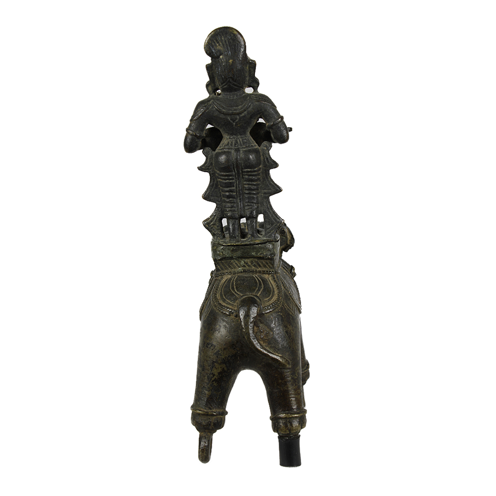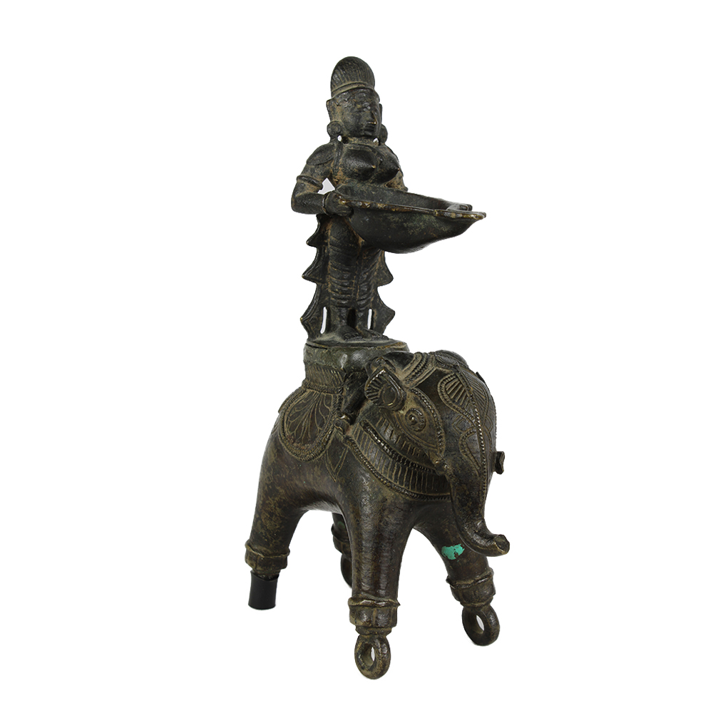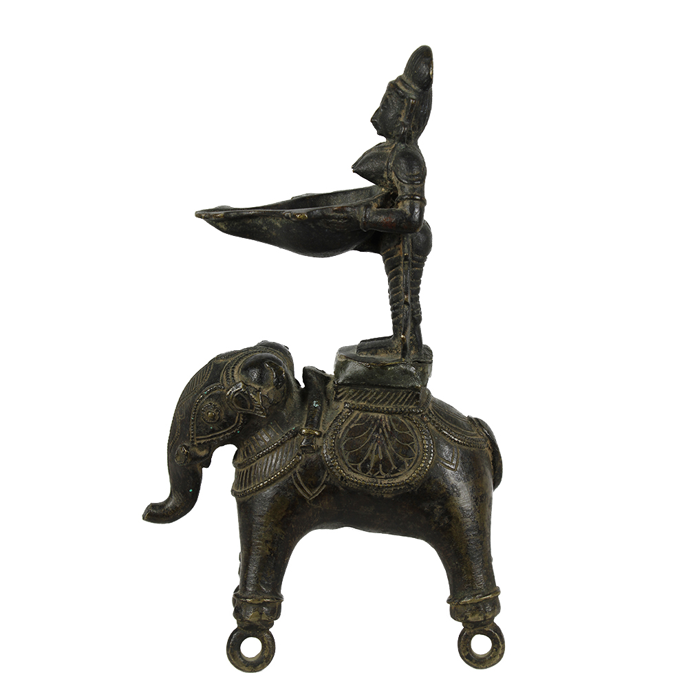 LAMPADA VOTIVA ad olio in bronzo raffigurante personaggio epico su elefante. Bengala occidentale. India h cm 23 x 14 x 6