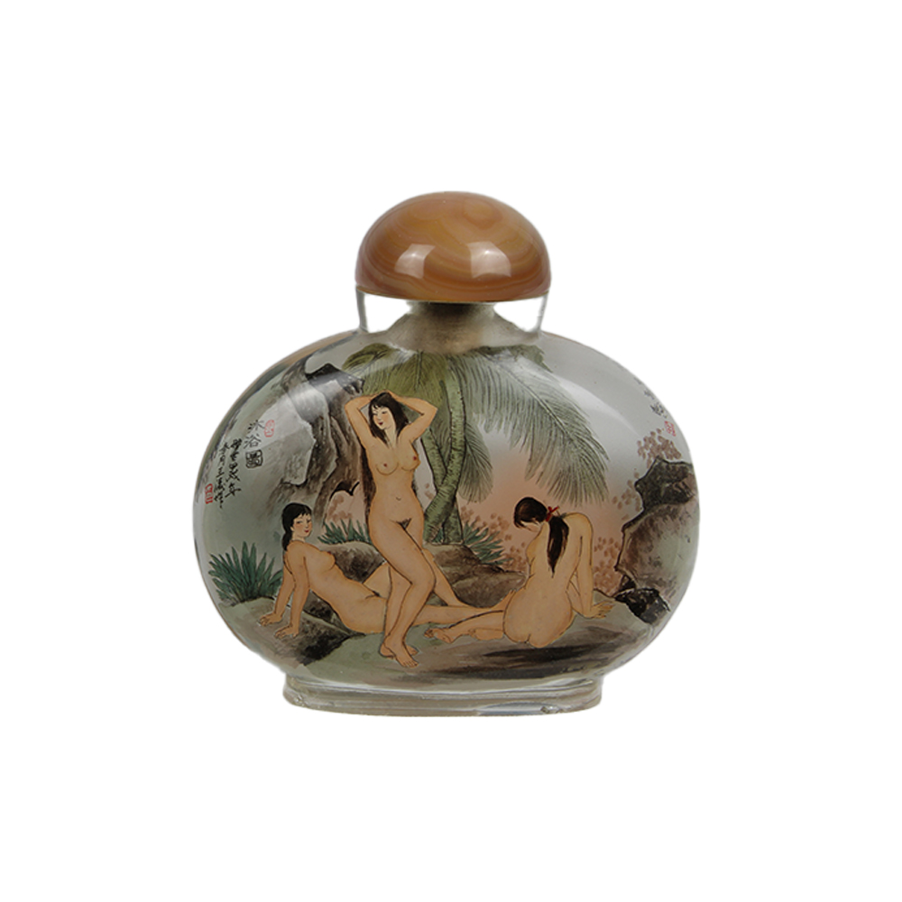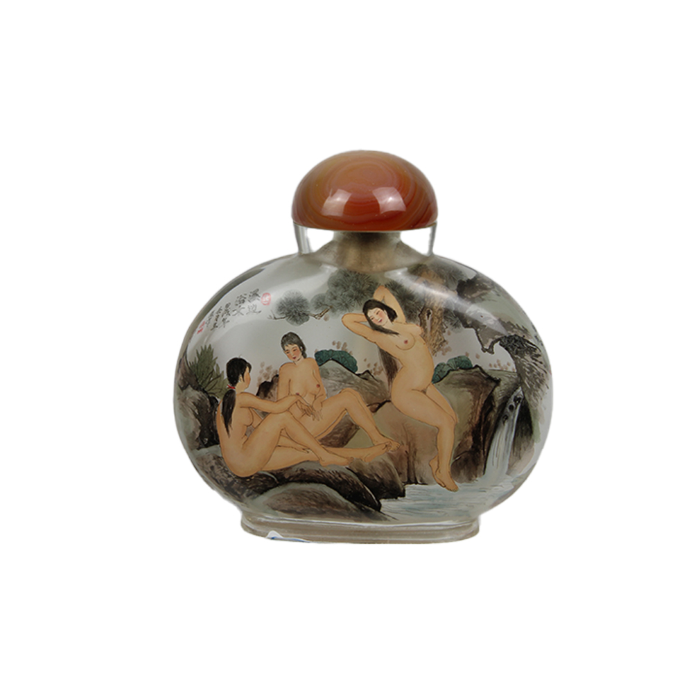 BOTTIGLIETTA PORTA PROFUMI in cristallo dipinto dall'interno raffigurante nudi di donna. Cina h cm 9,5 x 9
