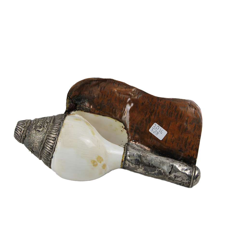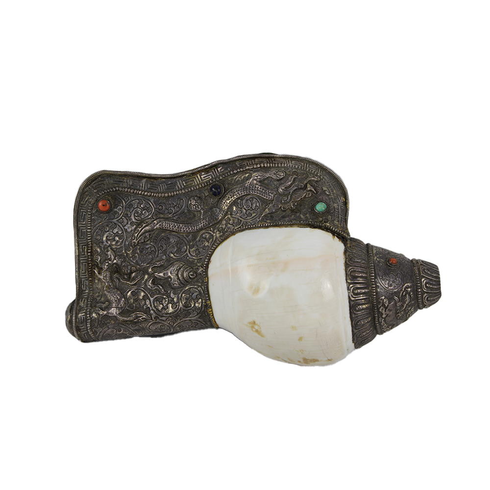 CONCHIGLIA RITUALE SANKHA in metallo argentato rame conchiglia levigata di turminella pyrum turchesi e coralli. Con il suo suono, la conchiglia ha la funzione per richiamare i fedeli per alcuni doveri quotidiani e anche per situazioni d'urgenza. Nepal h cm 24 x 15