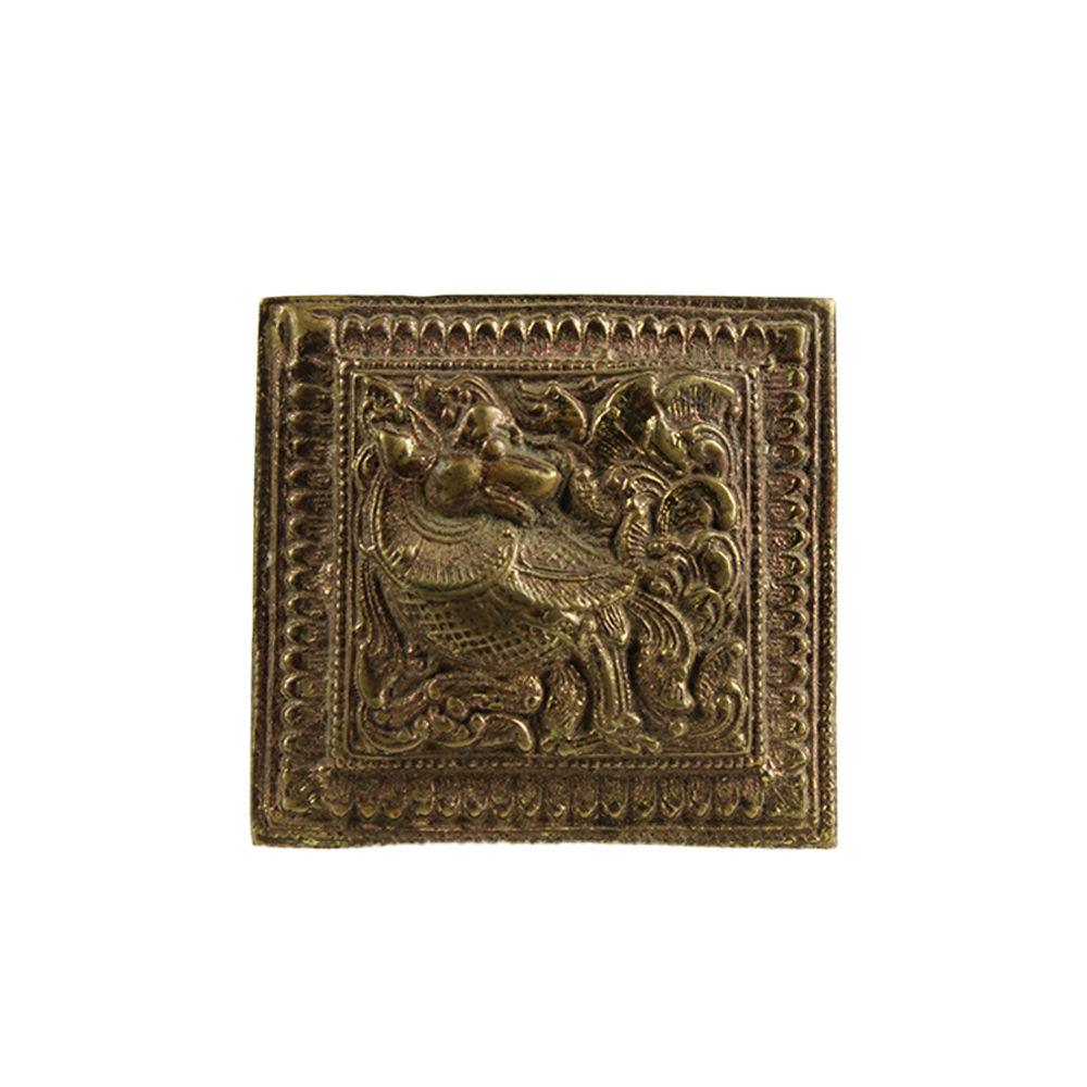 PICCOLA PLACCHETTA in metallo dorato lavorato a rilievo con raffigurazioni caratteristiche. India h cm 4,5 x 4,5