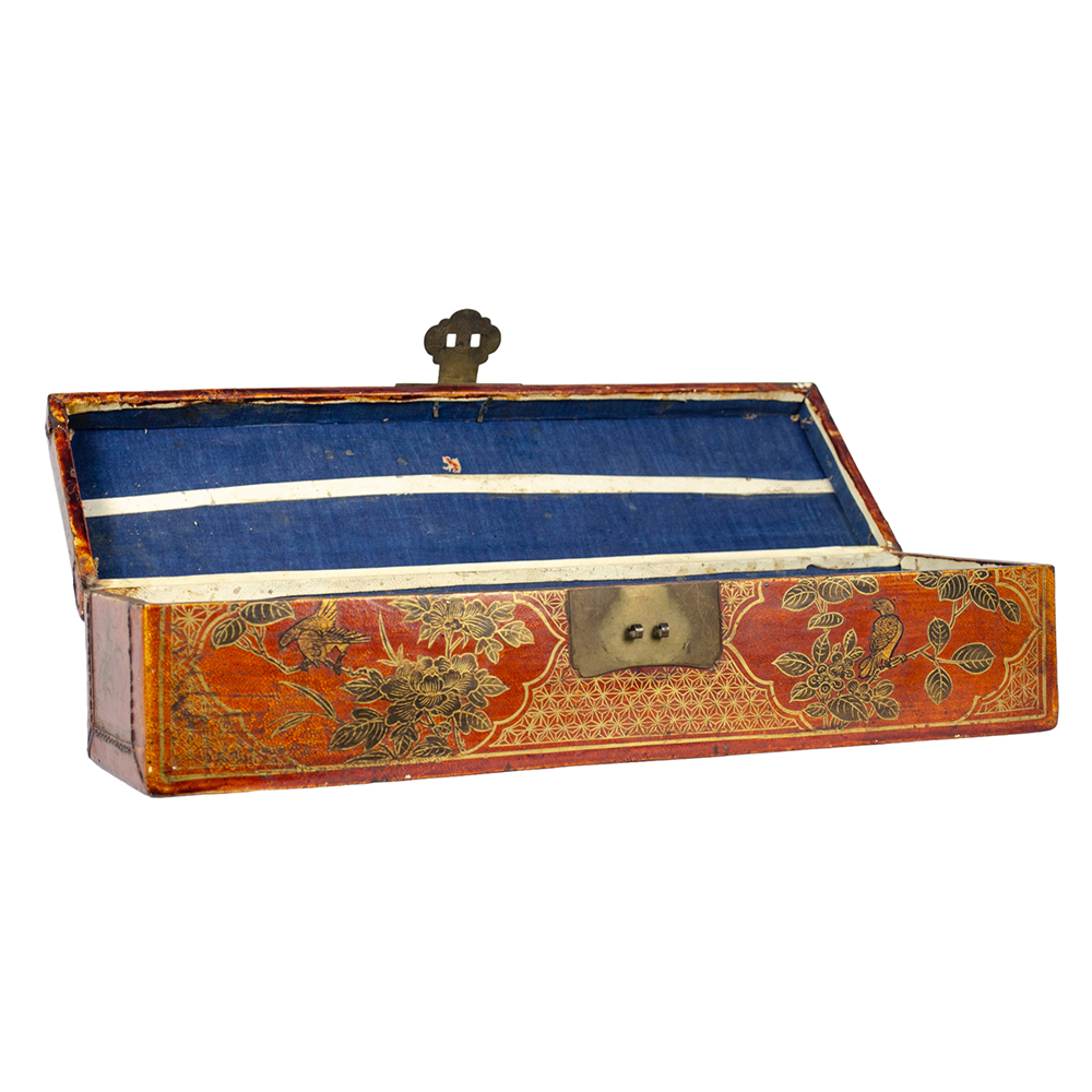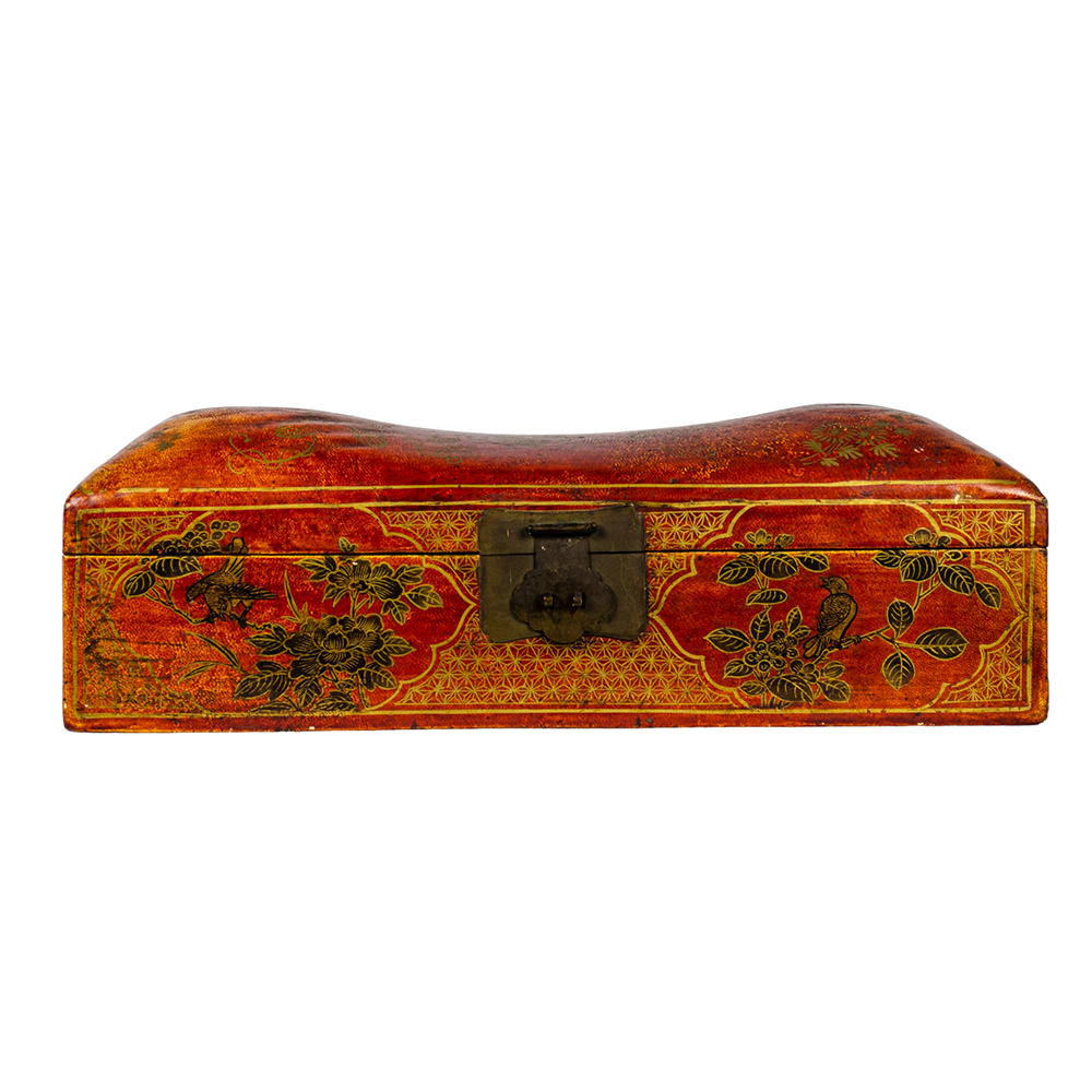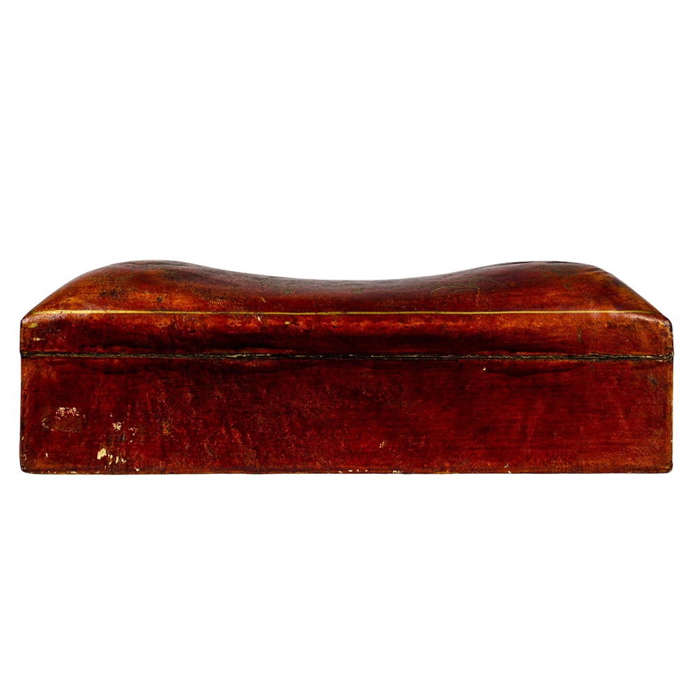 CURIOSA SCATOLA POGGIATESTA in cuoio decorata con lumeggiature in oro a motivi floreali e cineseria, chiusura in ottone .Manifattura anglo-cinese XVIII secolo h cm 16 x 49,5 x 15,5