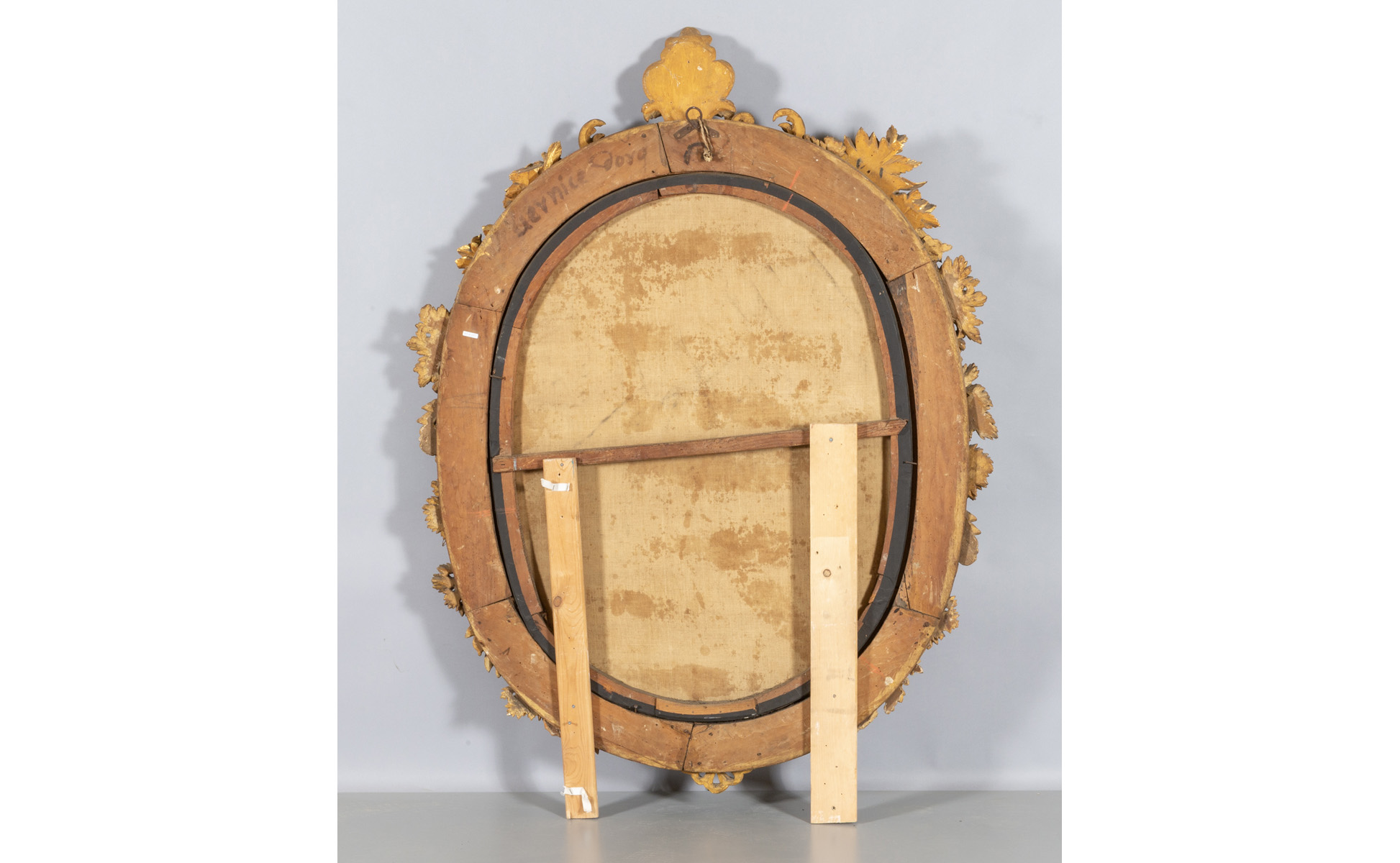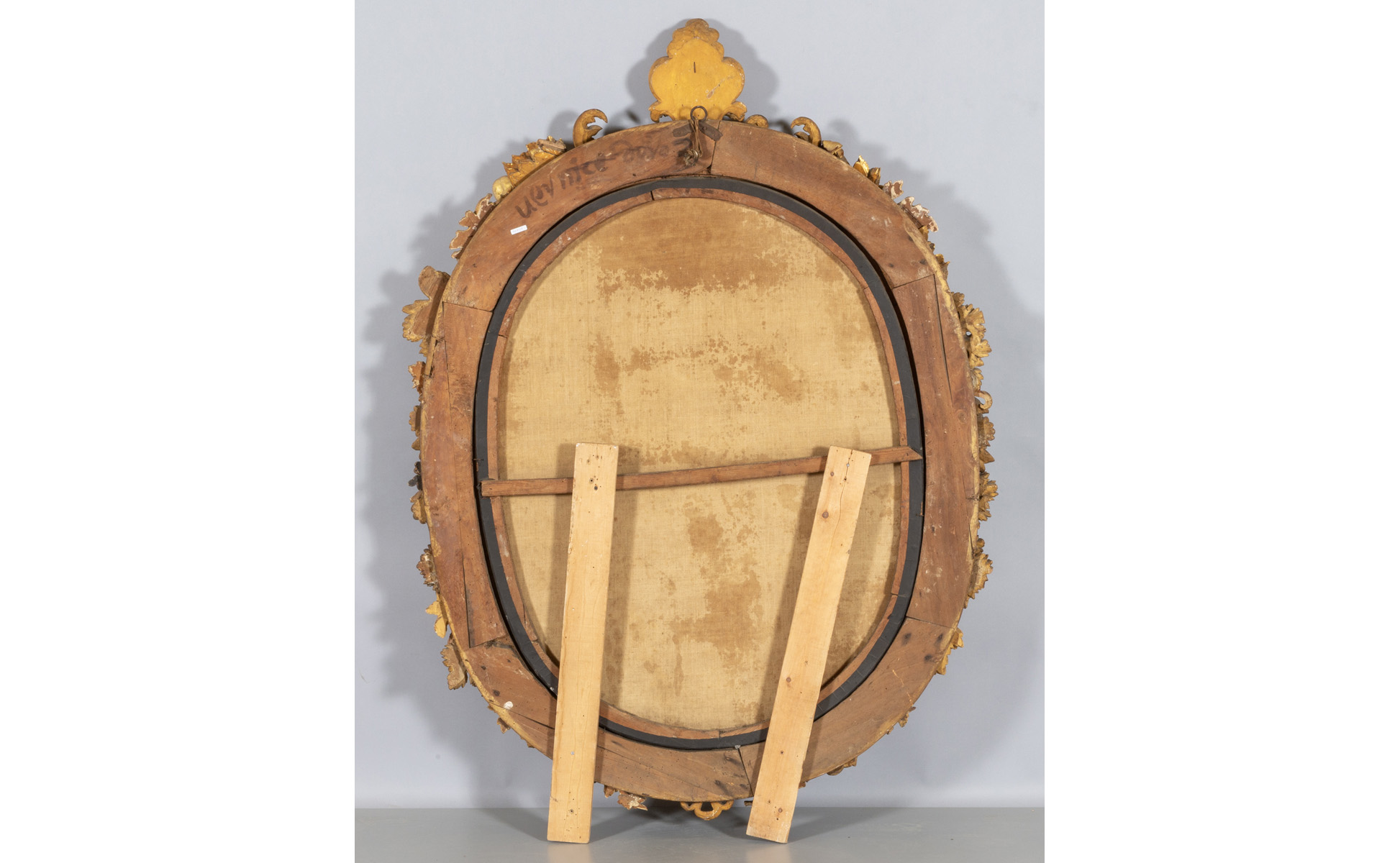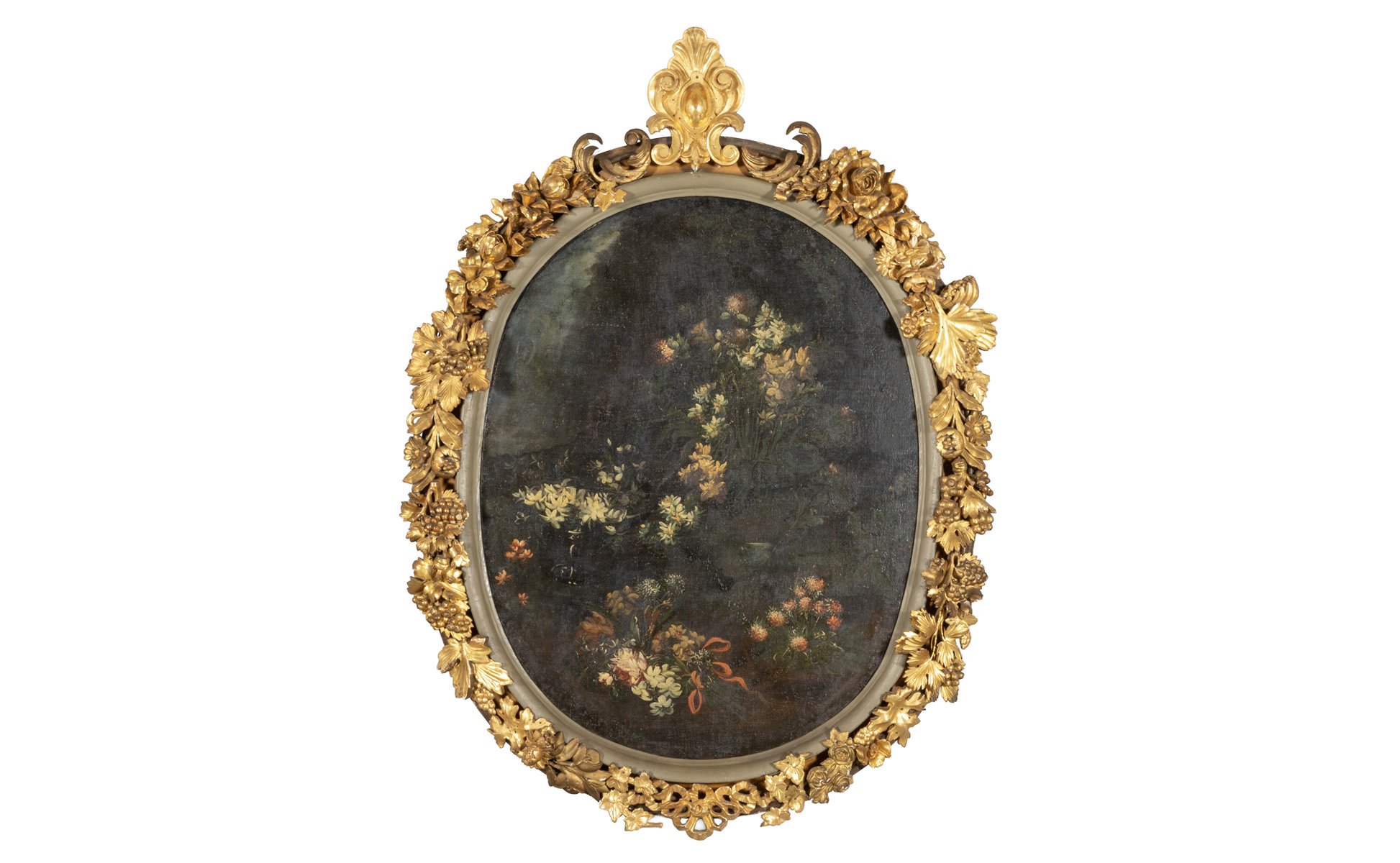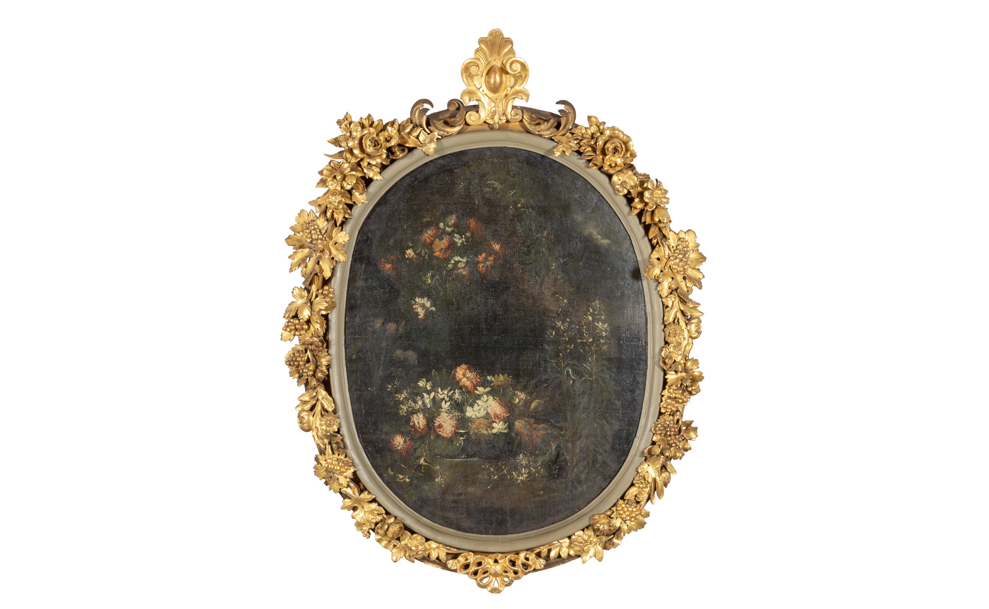 Scuola lombarda sec.XVIII 'Nature morte con fiori' coppia di olii di forma ovale cornici in legno intagliato e dorato del sec.XIX