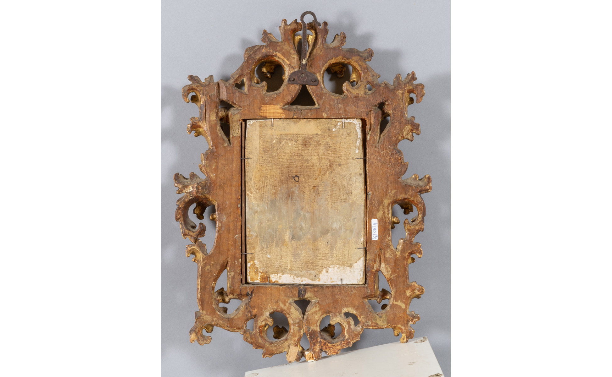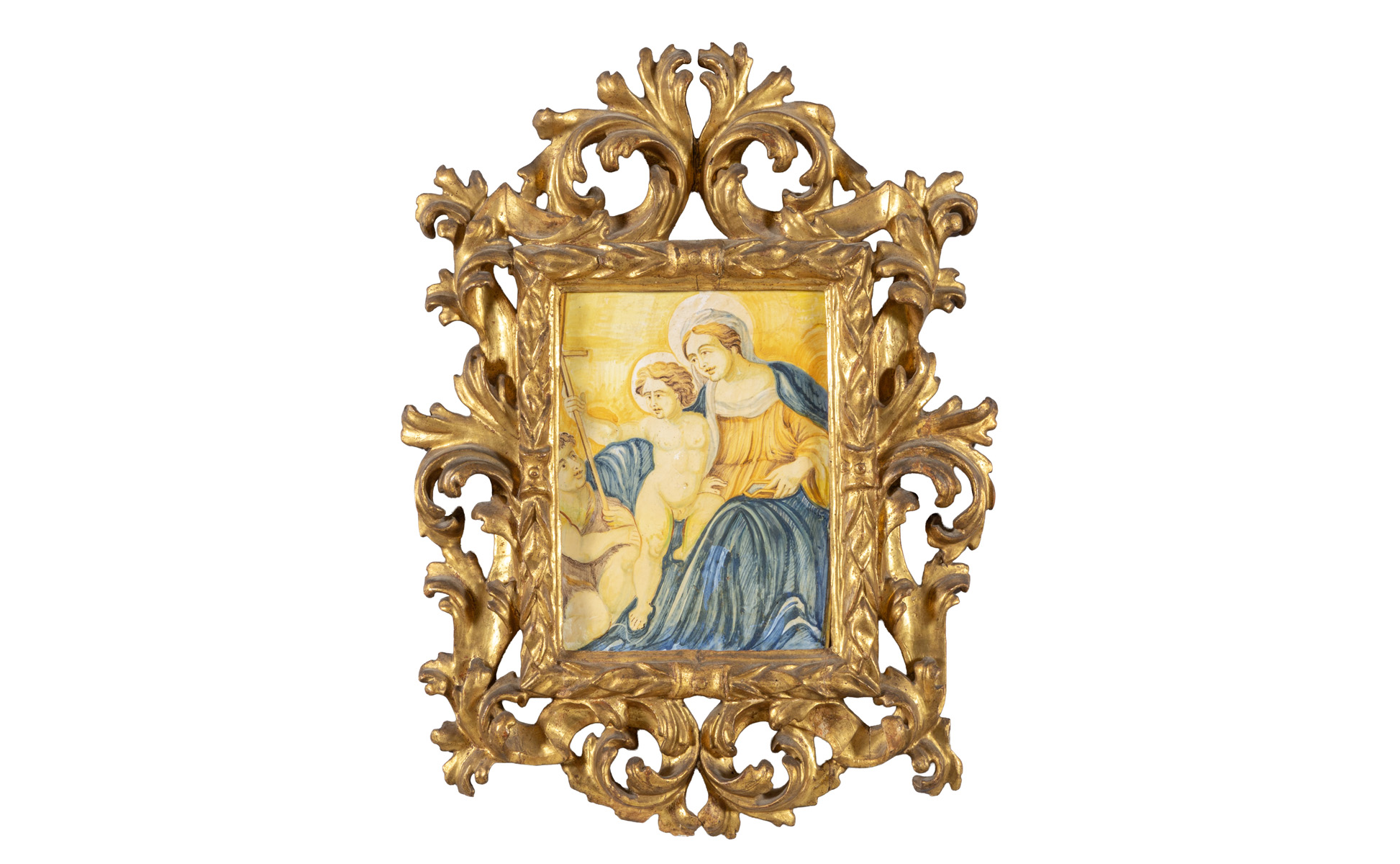 Placca in maiolica di Castelli raffigurante Madonna con Bambino e San Giovannino I metà sec.XVII cornice coeva in legno dorato