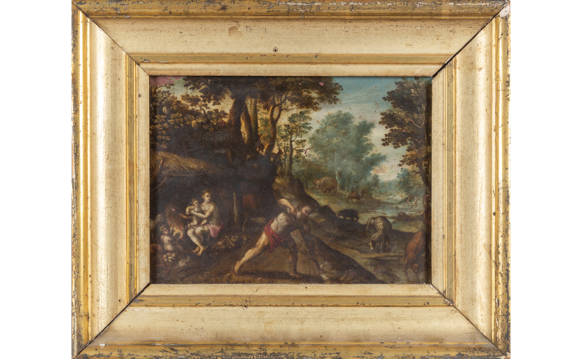 Scuola fiamminga sec.XVII 'La famiglia di Adamo tra animali esotici e fantastici' olio su rame