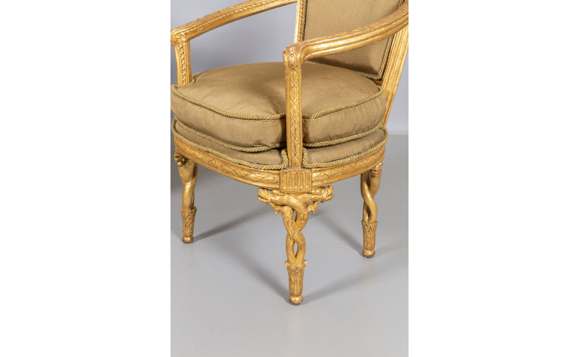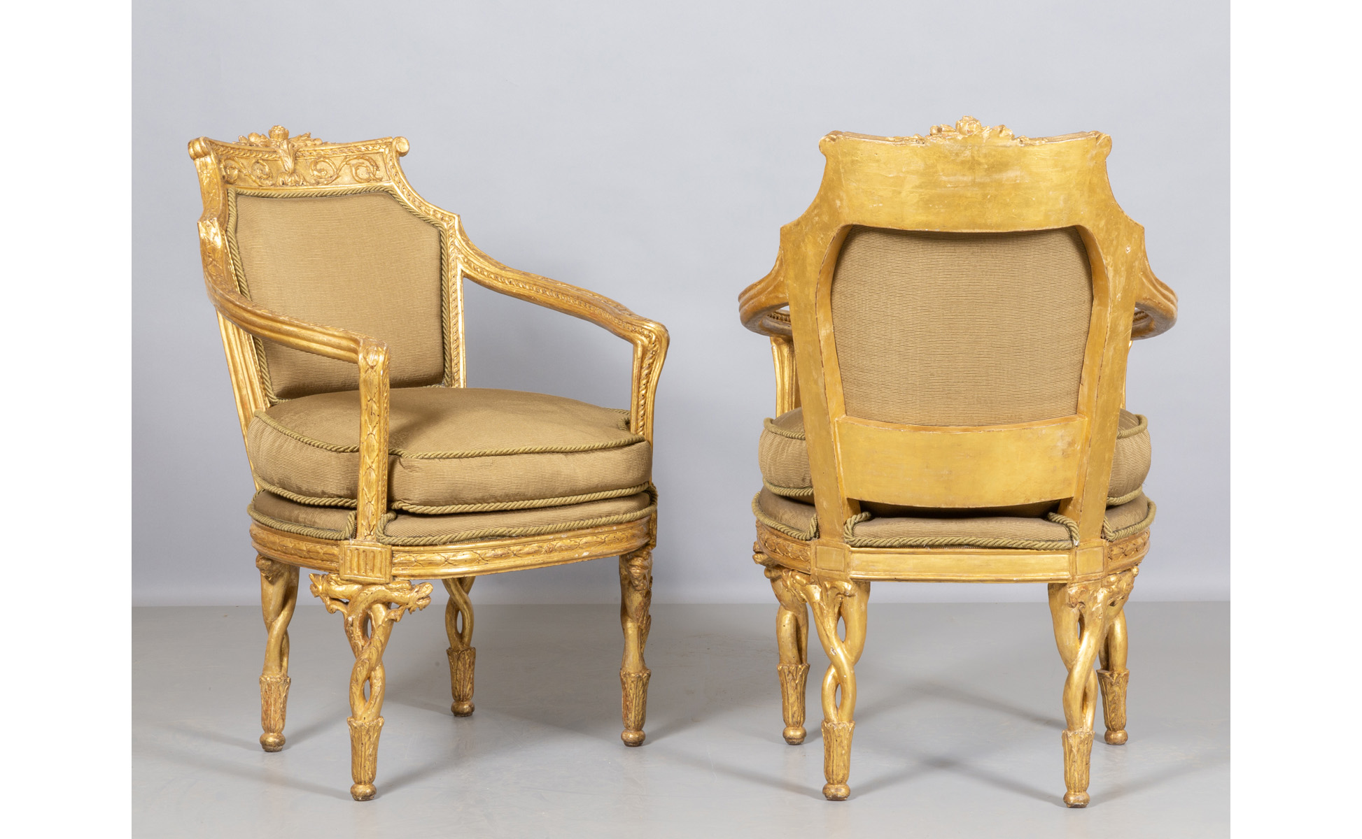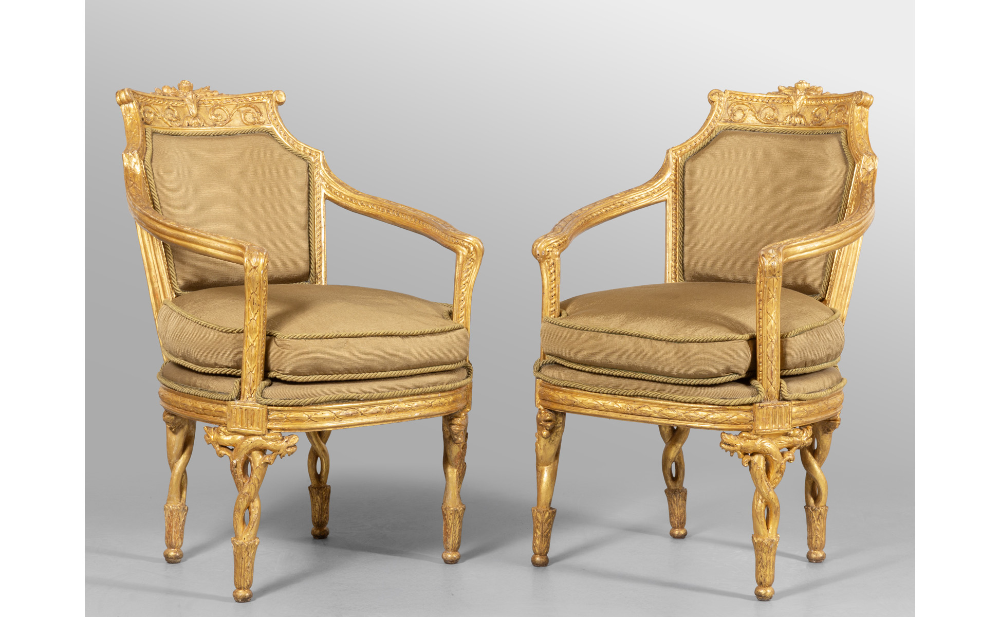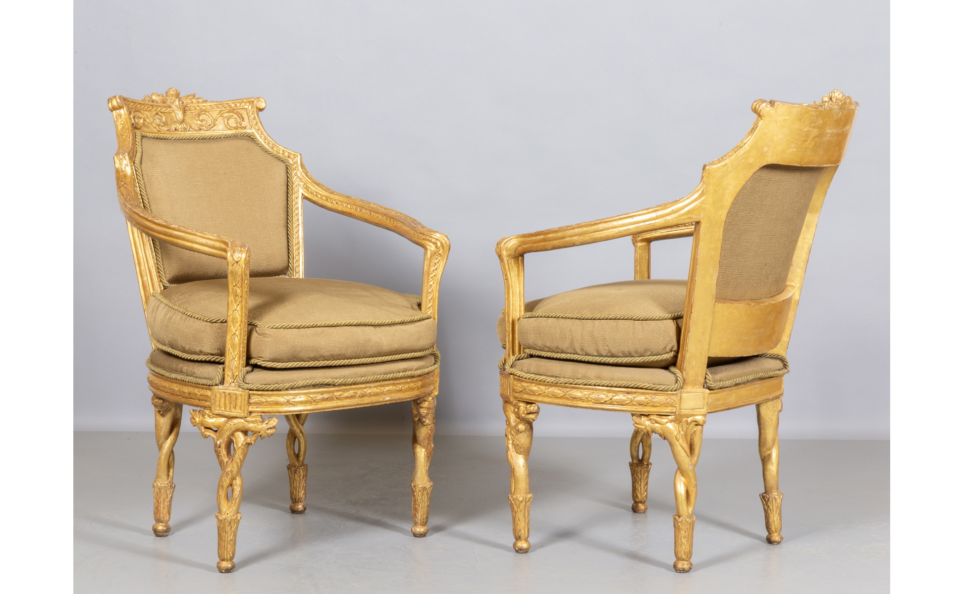 Coppia di poltrone Luigi XVI in legno finemente intagliato e dorato gambe a forma di draghi attorcigliati Genova II metà sec.XVIII