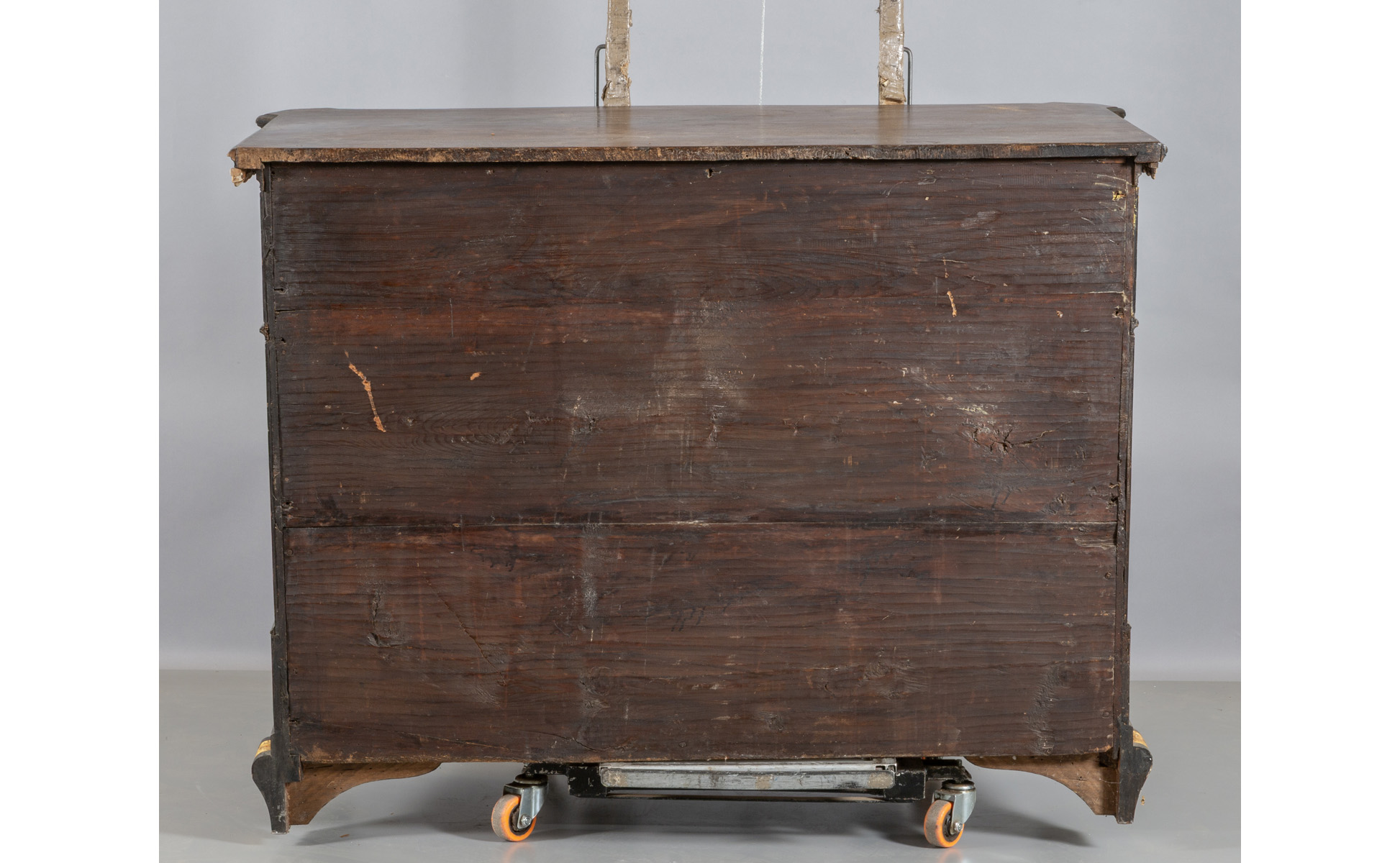 Canterano Luigi XIV lastronato in noce e radica di noce ricca decorazione di cornicette in legno ebanizzato fianchi scantonati intagliati e dorati piano in legno con sgocciolatoio intagliato e dorato Lombardia I metà sec.XVIII