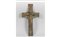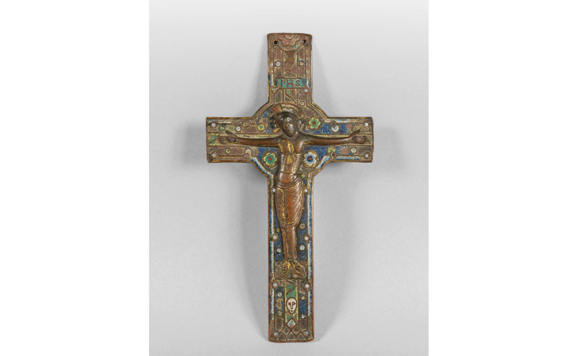 Croce processionale o da altare in bronzo dorato con smalti champlevé databile circa 1150/1200 sec.XII conservazione discreta con patina d'uso tracce di doratura originale alcuni smalti integri e altri lacunosi fondo in smalto blu cobalto tipica produzione della botteghe di Limoges o della regione Renana Germania. Il volto del Cristo mostra i tratti del Christus Triunphans nella parte superiore la scritta INRI nella base è visibile un teschio simbolo di Adamo e della Redenzione