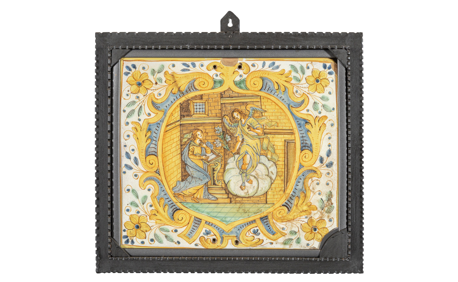 Annunciazione grande mattonella in maiolica di De Ruta fine sec.XVII
