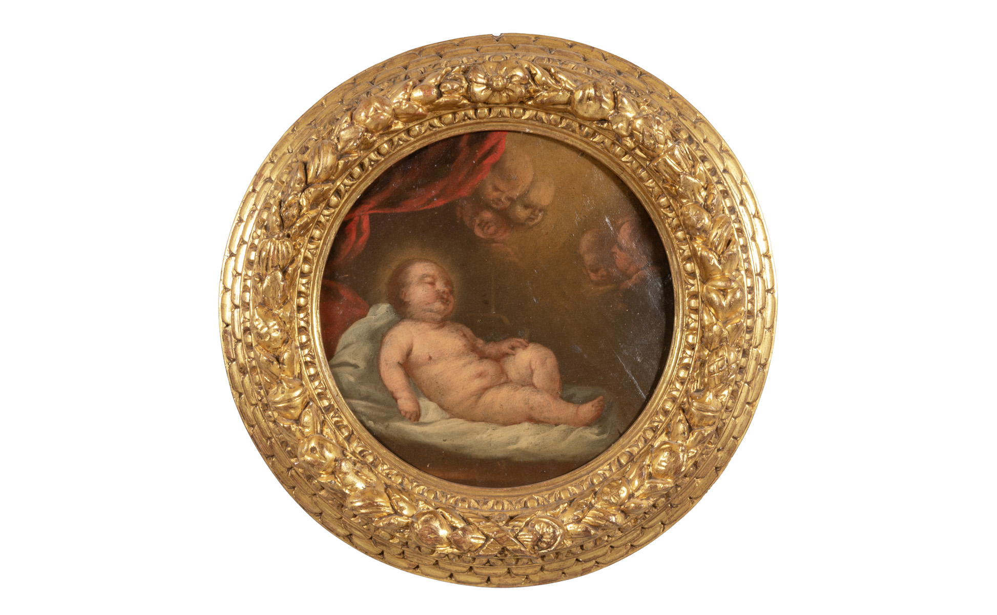 Scuola emiliana sec.XVIII 'Gesù Bambino dormiente' olio di forma rotonda