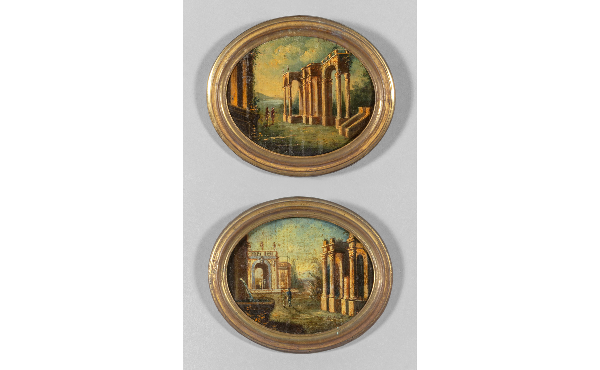 Scuola veneta II metà sec.XVIII 'Paesaggi con personaggi' coppia di olii di forma ovale