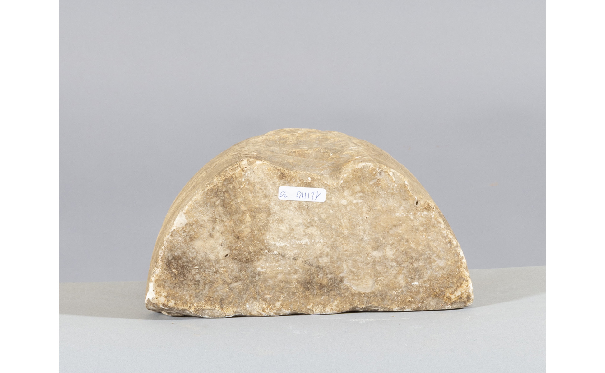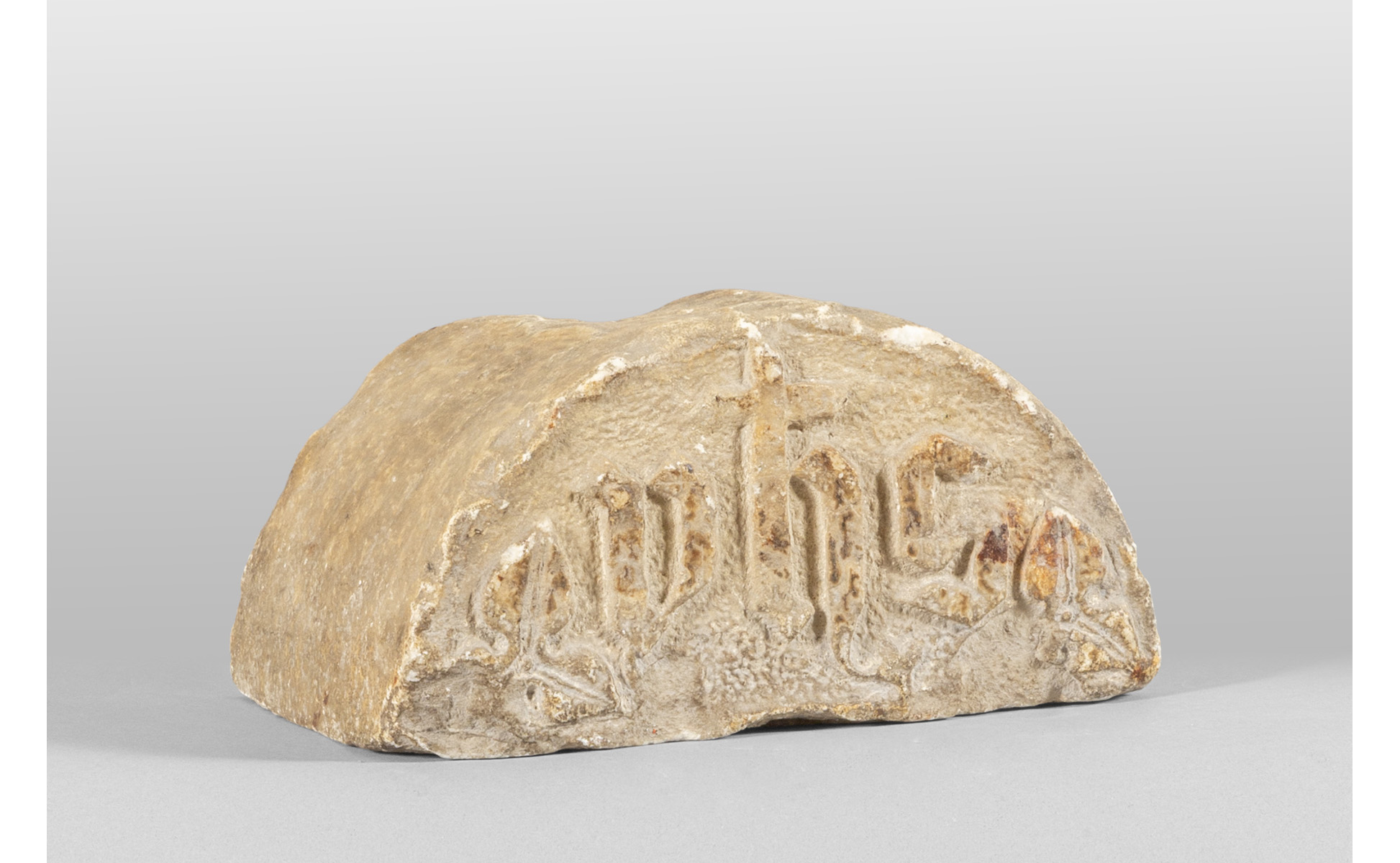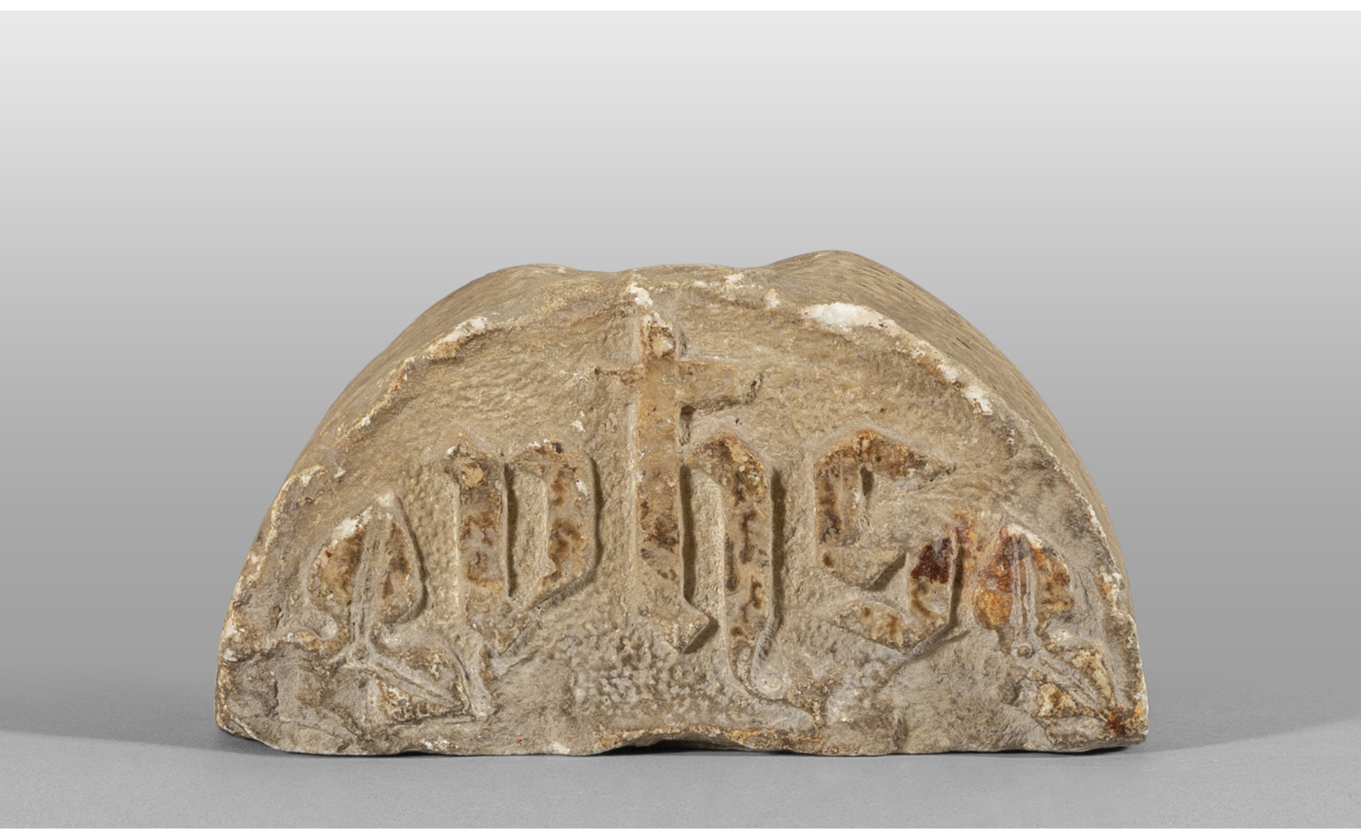 Base in marmo medioevale con scritta IHS lumeggiato in oro sec.XIV