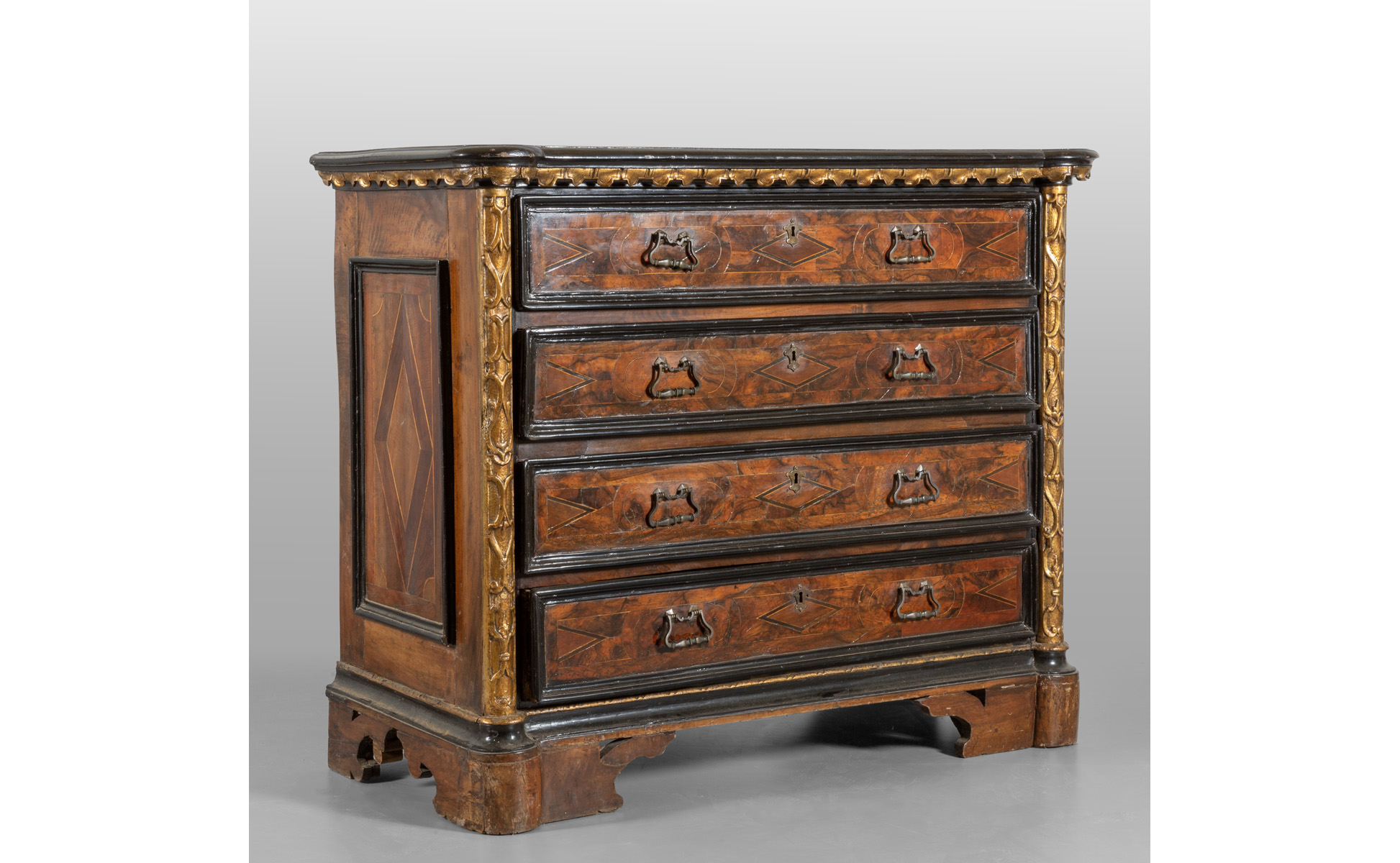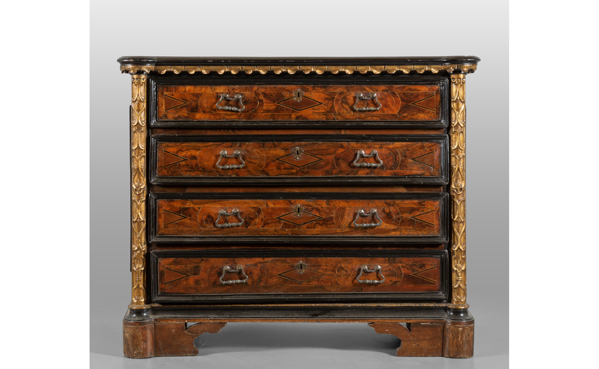 Canterano Luigi XIV lastronato in noce e radica di noce montanti in legno intagliato e dorato quattro cassetti Lombardia I metà sec.XVIII