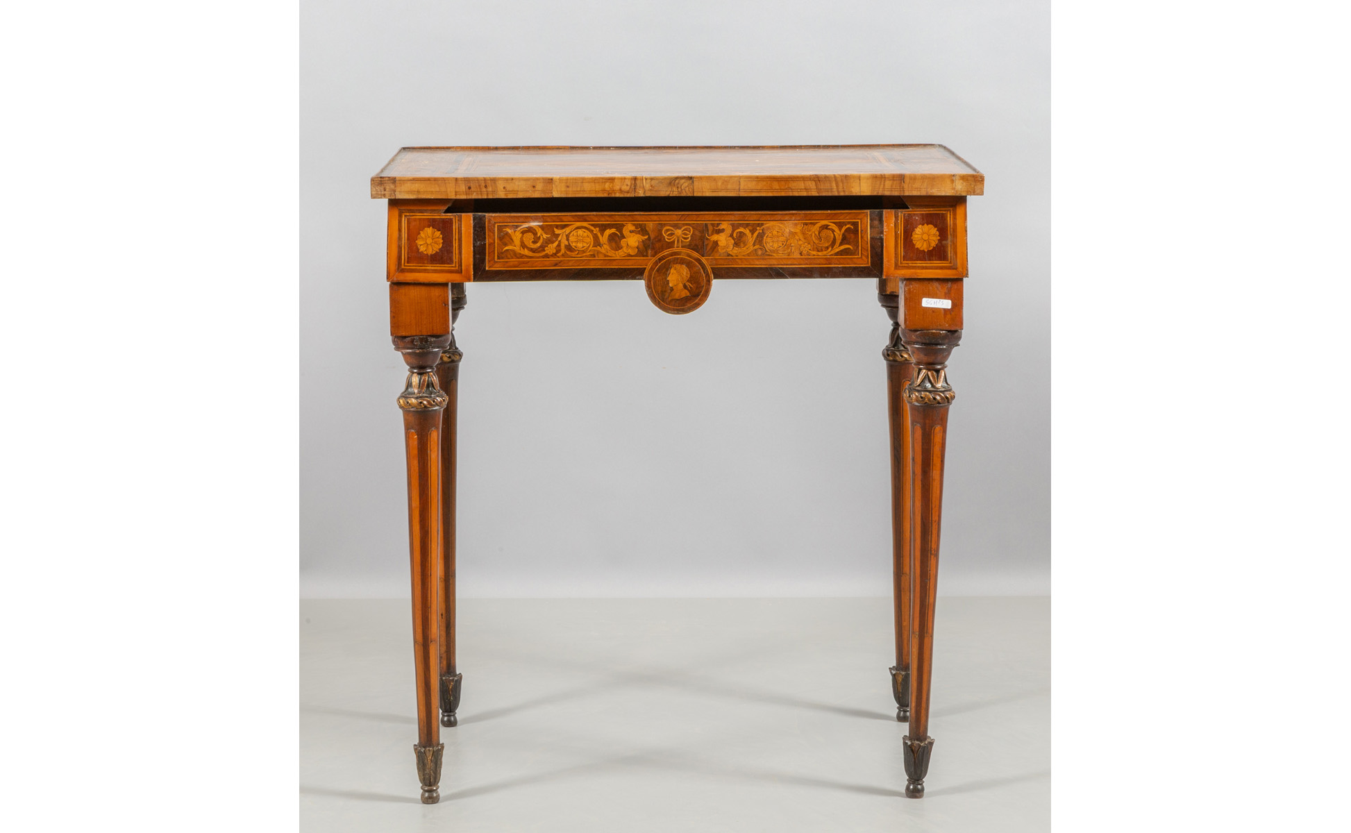 Tavolino Luigi XVI da centro in legno finemente lastronato in legni vari a motivi geometrici e medaglioni con personaggi un cassetto nella fascia pianetto a scrittoio estraibile gambe rotonde con intarsi capitelli e piedini con profili dorati Lombardia II metà sec.XVIII