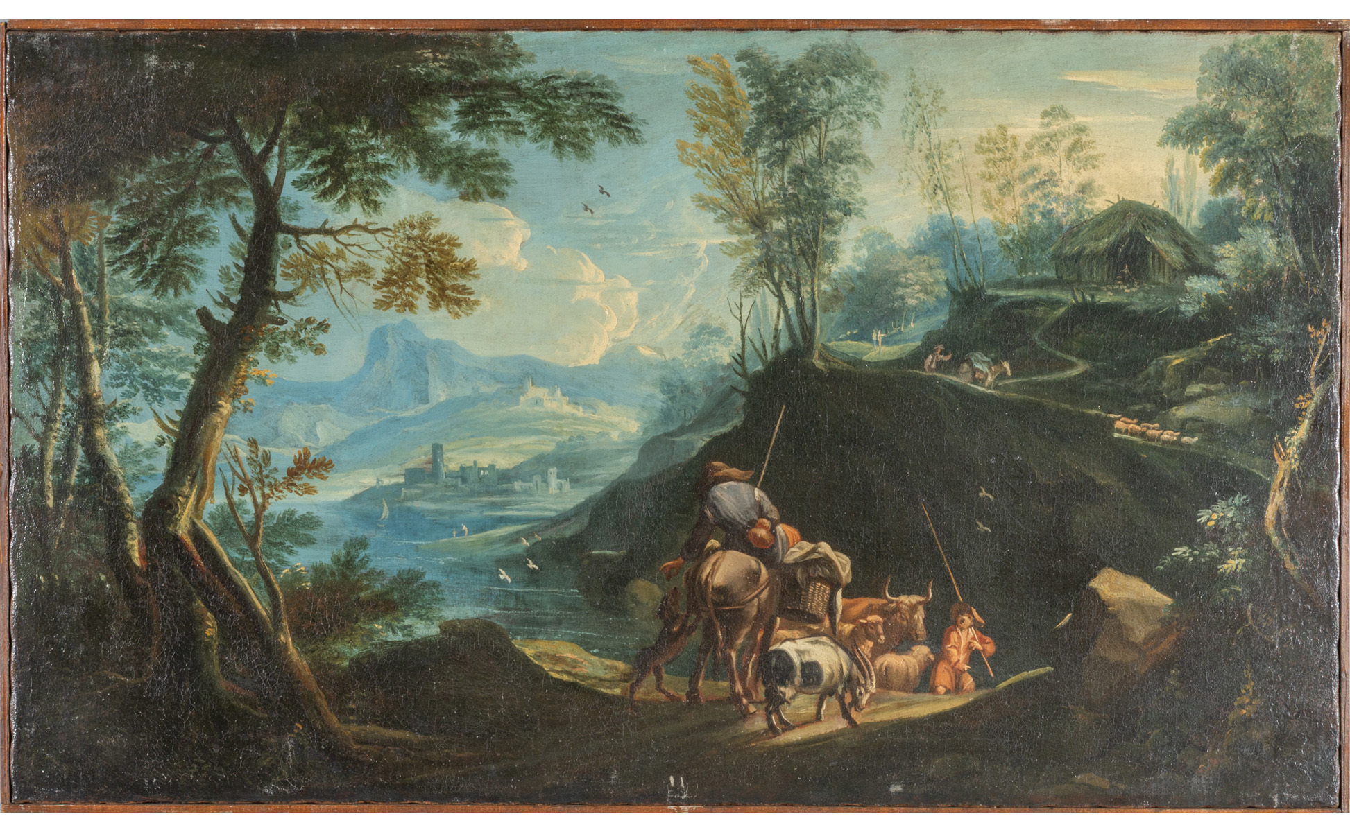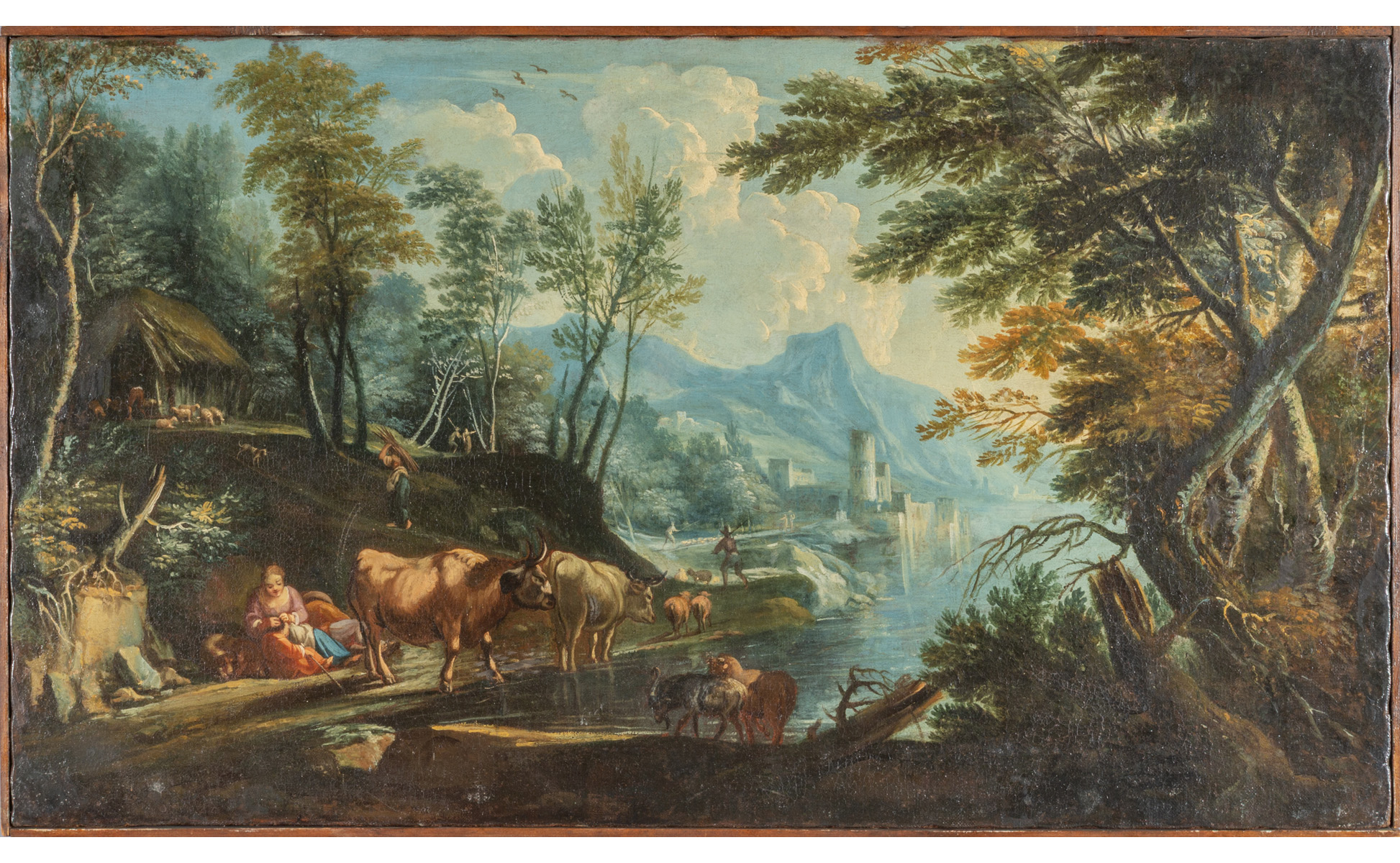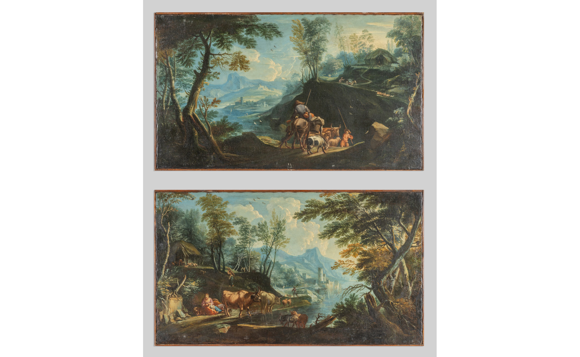 Scuola veneta sec.XVIII 'Paesaggi con pastori e armenti' coppia di olii