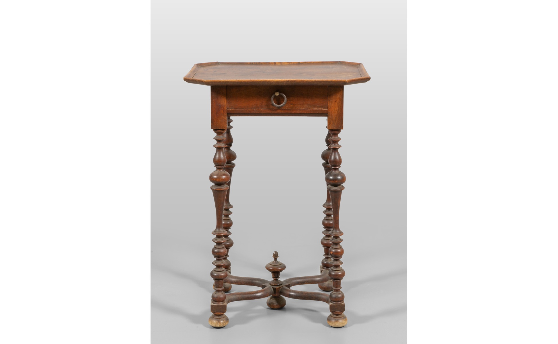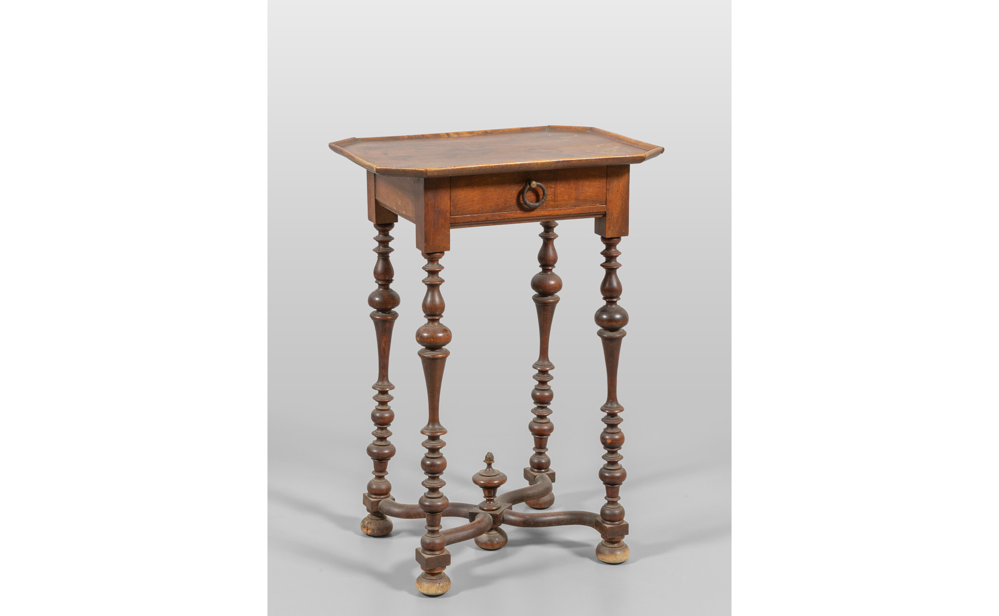 Tavolinetto da appoggio a rocchetto in noce in stile antico gambe unite da traversa