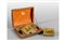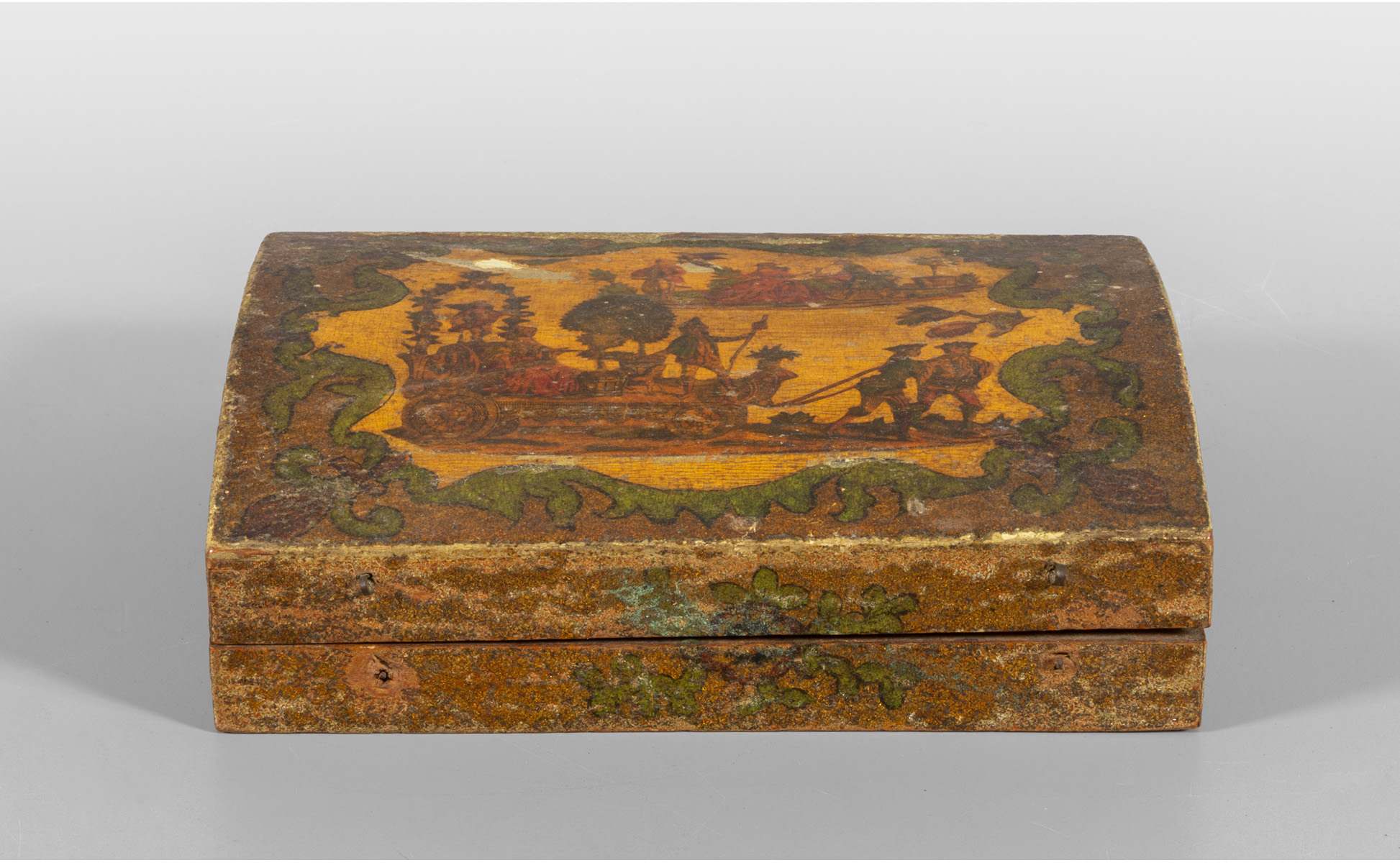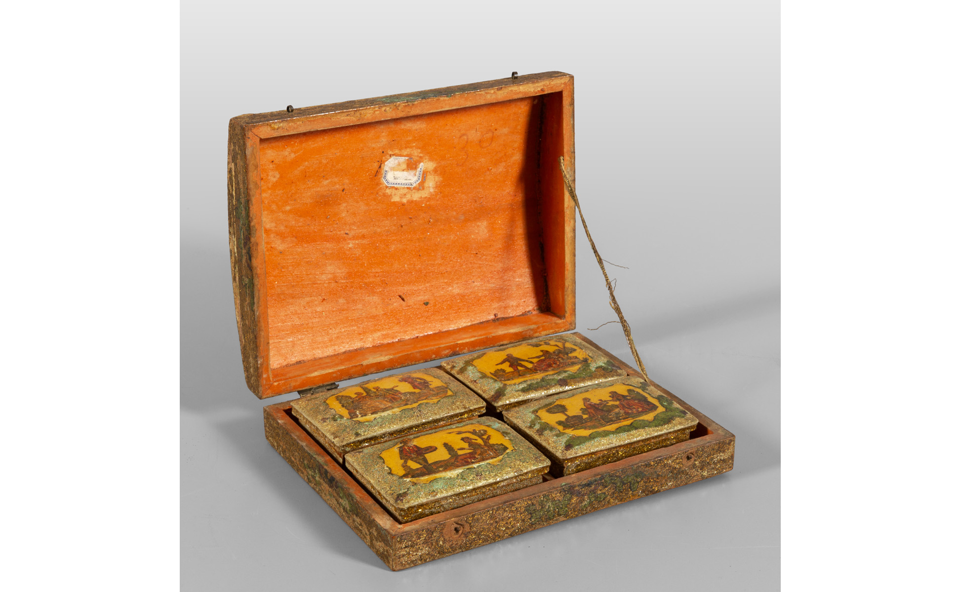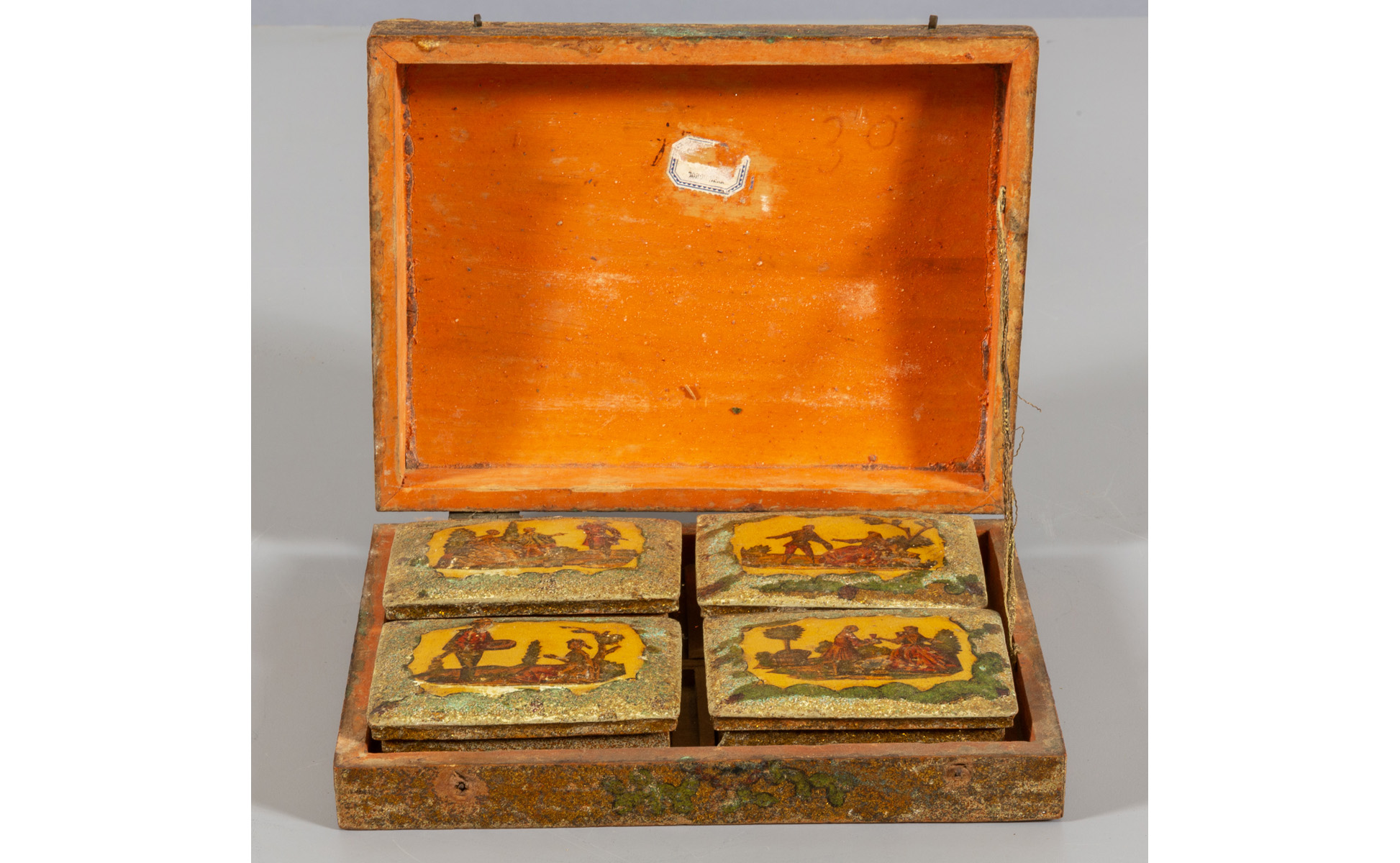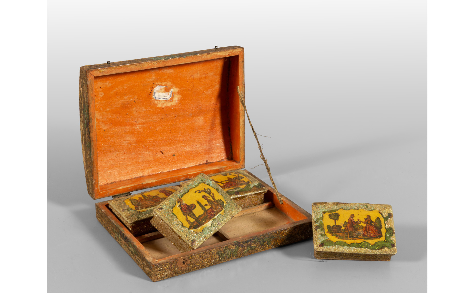 Scatola portafiches in legno laccato e dorato con figurine in arte povera all'interno quattro scatolette laccate Venezia sec.XVIII